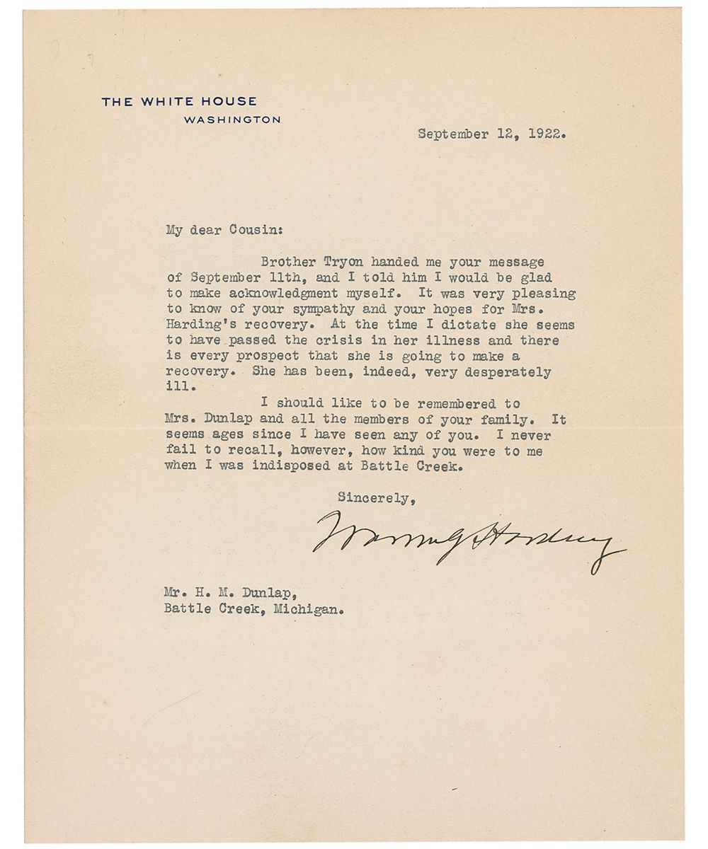 TLS as president, one page, 7 x 9, White House letterhead, September 12, 1922. A letter to H. M. Dunlap. In full: “Brother Tyron handed me your message of September 11th, and I told him I would be glad to make acknowledgment myself. It was very pleasing to know of your sympathy and your hopes for Mrs. Harding’s recovery. At the time I dictate she seems to have passed the crisis in her illness and there is every prospect that she is going to make a full recovery. She has been, indeed, very desperately ill. I should like to be remembered to Mrs. Dunlap and all the members of your family. It seems ages since I have seen any of you. I never fail to recall, however, how kind you were to me when I was indisposed at Battle Creek.” In fine condition, with light scattered creases and a paperclip impression to the top left. In early September the First Lady had collapsed with kidney failure, a recurring problem throughout her life that would eventually result in her death. Accompanied by the original White House mailing envelope.