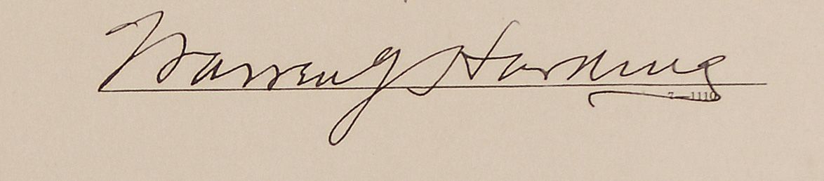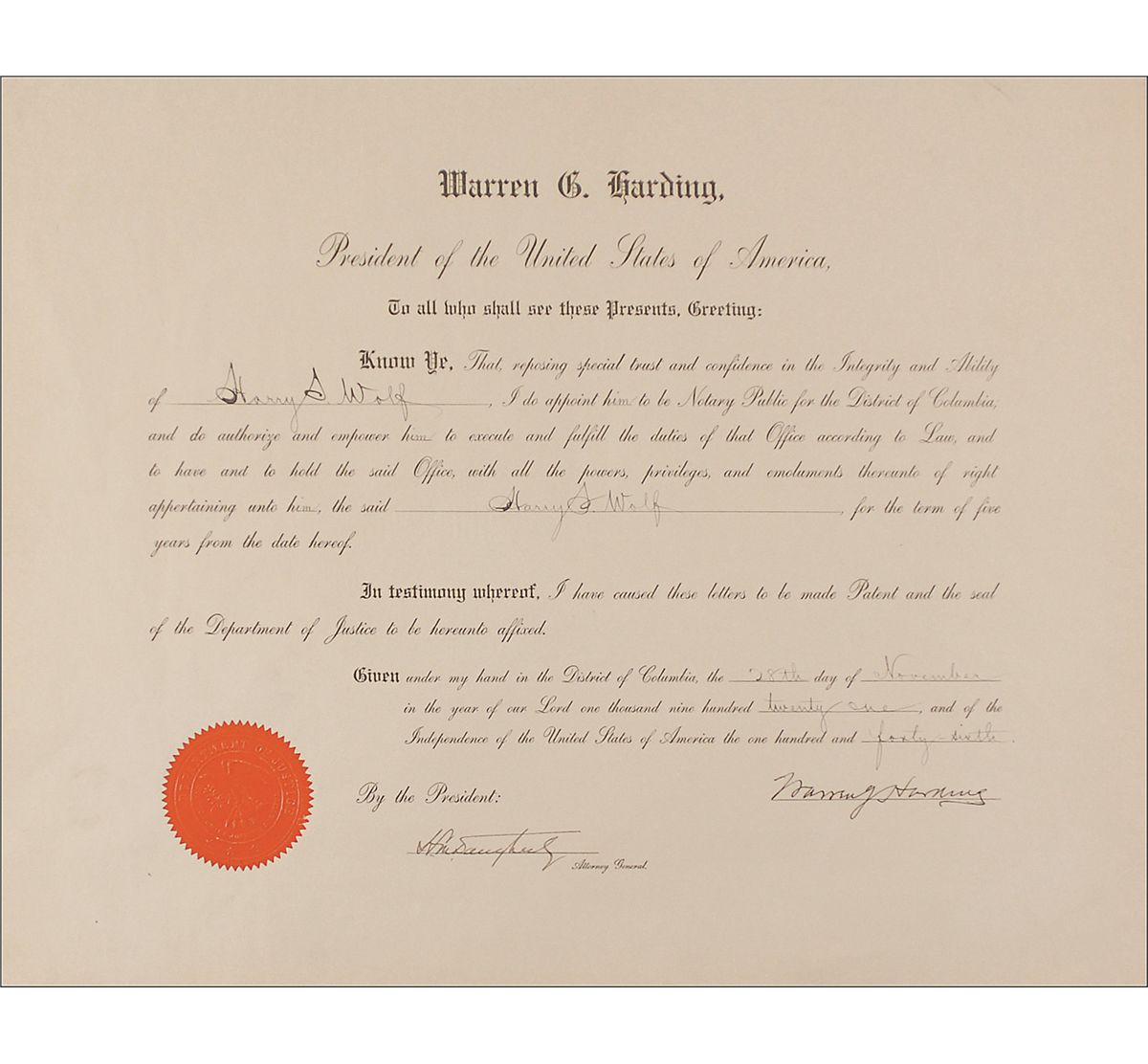 Partly-printed DS as president, one page, 19 x 15, November 28, 1921. President Harding appoints Harry S. Wolf as “Notary Public for the District of Columbia.” Boldly signed at the conclusion by Harding and countersigned by Attorney General Harry M. Daugherty. Embossed Department of Justice seal affixed to lower left. In fine condition, with a few light scattered creases, a small repaired tear to the top edge, and seal slightly worn but intact.