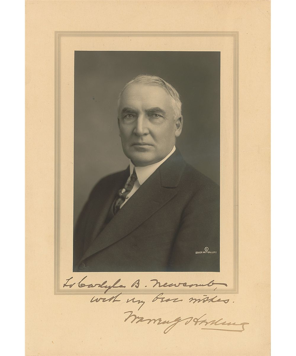 Vintage 6.75 x 9.75 Baker Art Gallery photo, signed and inscribed in the lower border in fountain pen “To Carlyle B. Newcomb, with my best wishes, Warren G. Harding.” A light central horizontal crease through image and a couple trivial spots to background, otherwise fine condition.