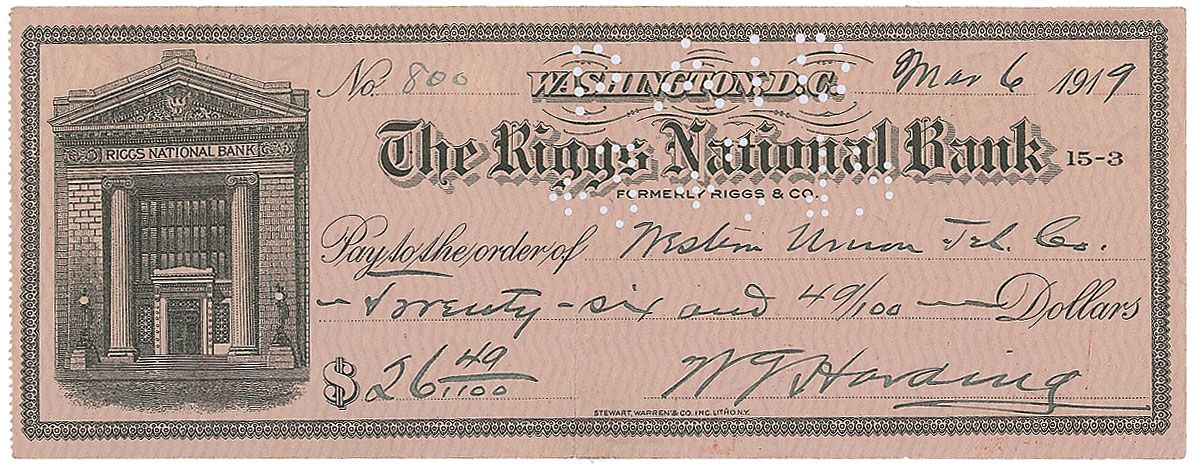 Riggs National Bank check, 7.5 x 2.75, filled out and signed by Harding, “W. G. Harding,” payable to the Western Union Tel. Co. for $26.49, March 6, 1919. In fine condition, with a light central vertical fold and expected cancellation holes.