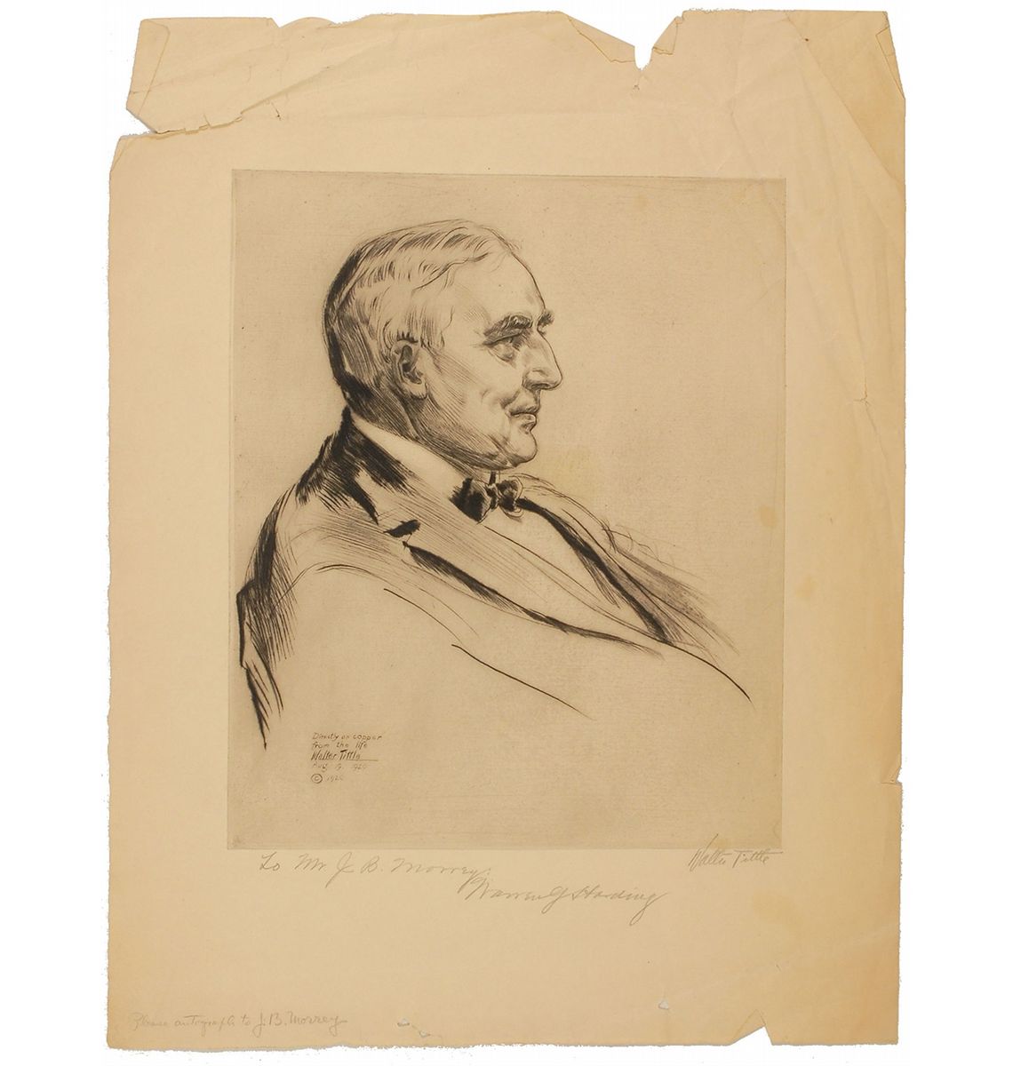 Original oversized copper etching of Harding in profile, 14 x 18.5, by Walter Tittle, bearing a 1920 copyright date, signed and inscribed in the lower border in pencil, “To Mr. J. B. Morrrey: Warren G. Harding,” and also signed in pencil by the artist, Walter Tittle. Very bottom has a collector’s instruction to Harding concerning the inscription. In very good to fine condition, with several edge tears and areas of paper loss, scattered moderate creasing and toning, and a few small spots. Most of the flaws could be matted out for presentation, as most of the flaws are to the borders.