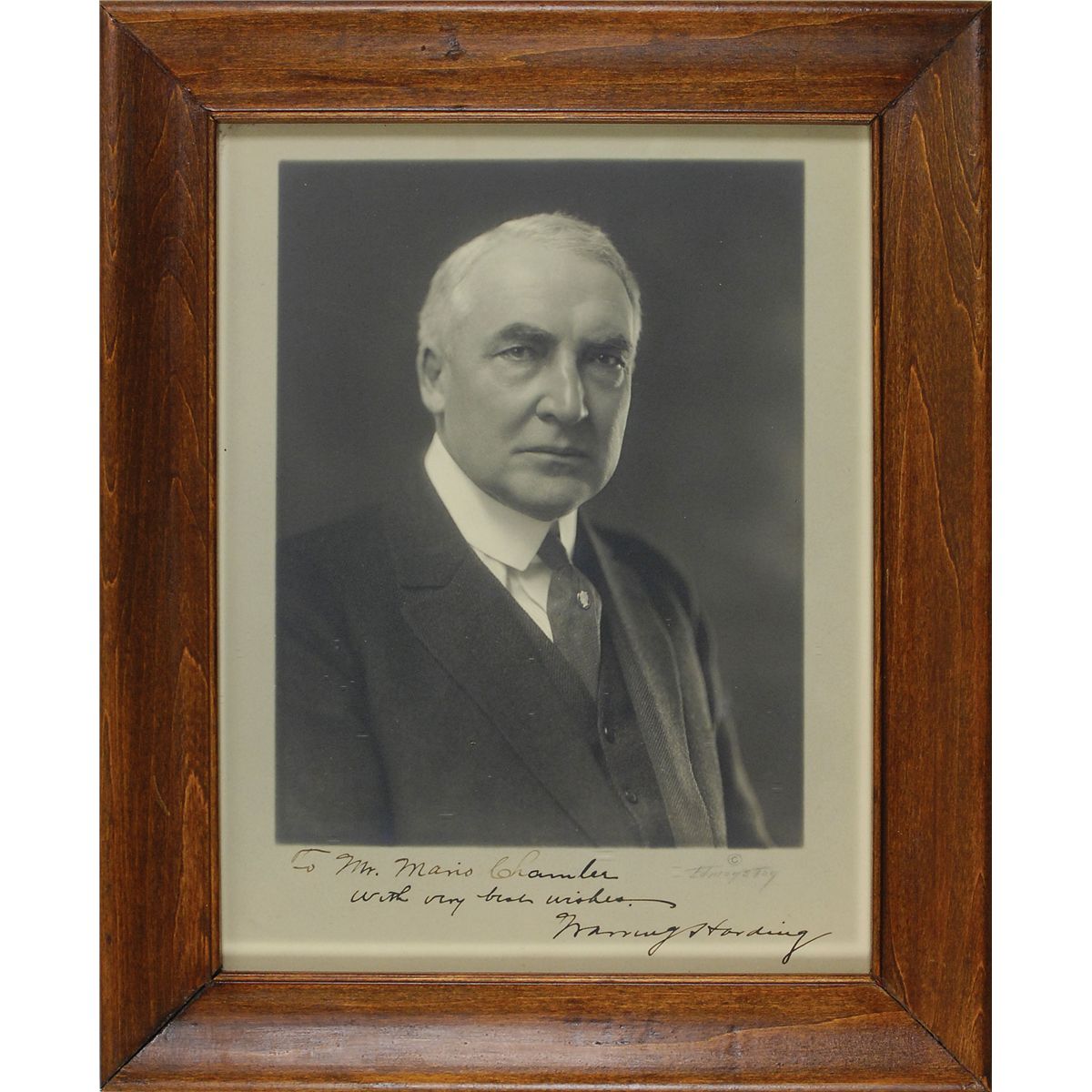 Vintage matte-finish 8 x 10.25 Edmonston photo, signed and inscribed in the lower border in fountain pen, “To Mr. Maris Chamber, with very best wishes, Warren G. Harding.” In fine condition, with a light crease to right edge.