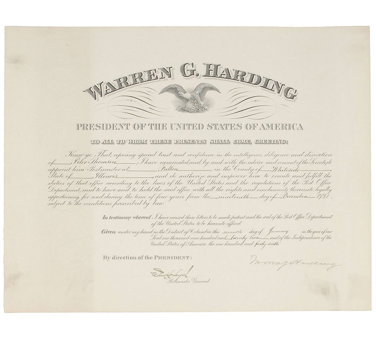 Partly-printed DS as president, one page, 18 x 14, January 7, 1922. President Harding appoints Peter Thomsen to be postmaster of Fulton, Illinois. Signed at the bottom by Harding and countersigned by Postmaster General William H. Hays. Light rectangular area of toning to left side, a few bends and creases, and some light soiling to lower right corner, otherwise fine condition.