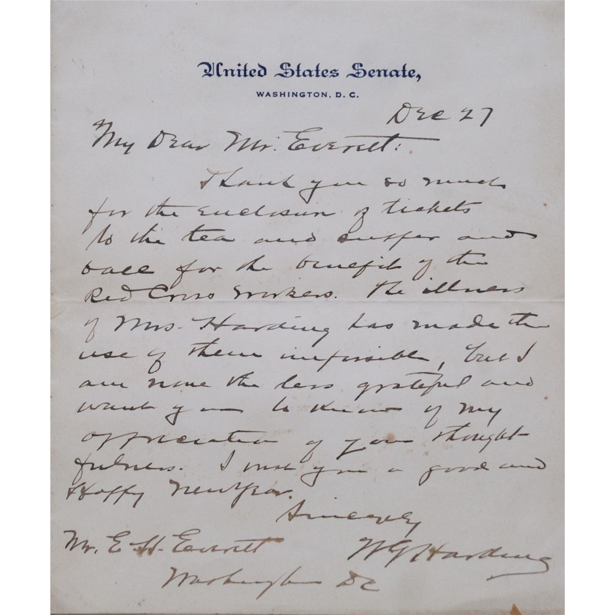 29th President of the U.S. ALS on Senate letterhead Dec. 27 (ny). Friendly letter to Mr. E. H. Everett thanking him for the tickets to the tea and supper and ball for the benefit of the Red Cross workers. He will not be able to attend because of Mrs., Harding’s illness. Edward H. Everett, a native of Cleveland, was a multimillionaire industrialist and philanthropist who was maintaining residences in Washington, D.C., Bennington, Vermont, and Switzerland at the time of his death.At one time he was a large stockholder of the Anheuser Busch Co. of St. Louis.
