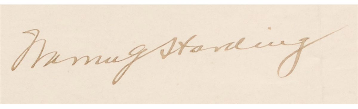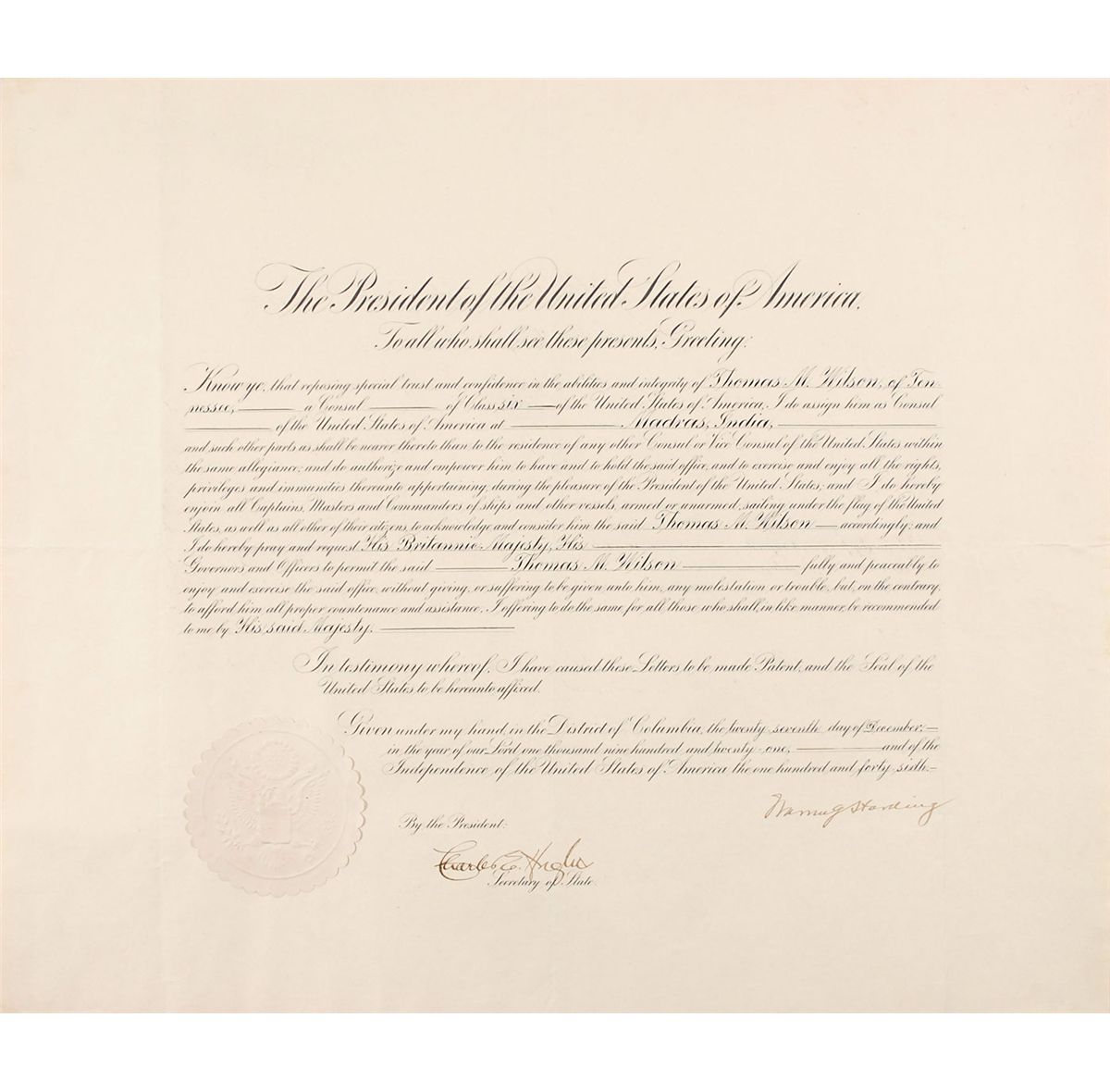 Partly-printed DS as president, one page, 23 x 19, December 27, 1921. Harding appoints “Thomas M. Wilson, of Tennessee, a Consul of Class six…I do assign him as Consul of the United States of America at Madras, India.“ Signed at the conclusion by Harding and countersigned by Secretary of State Charles Evans Hughes. In fine condition, with intersecting folds, some light mirroring of text, and a few wrinkles. The white wafer seal is crisp and intact.