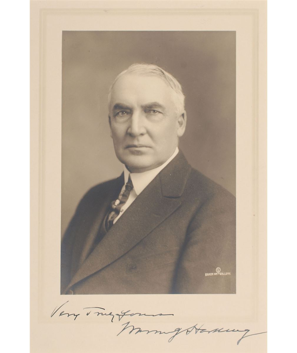 Handsome matte-finish 5.5 x 8 portrait of Harding by the Baker Art Gallery, signed in the lower border in fountain pen, “Very truly yours, Warren G. Harding.” Matted to an overall size of 9 x 14. In fine condition.