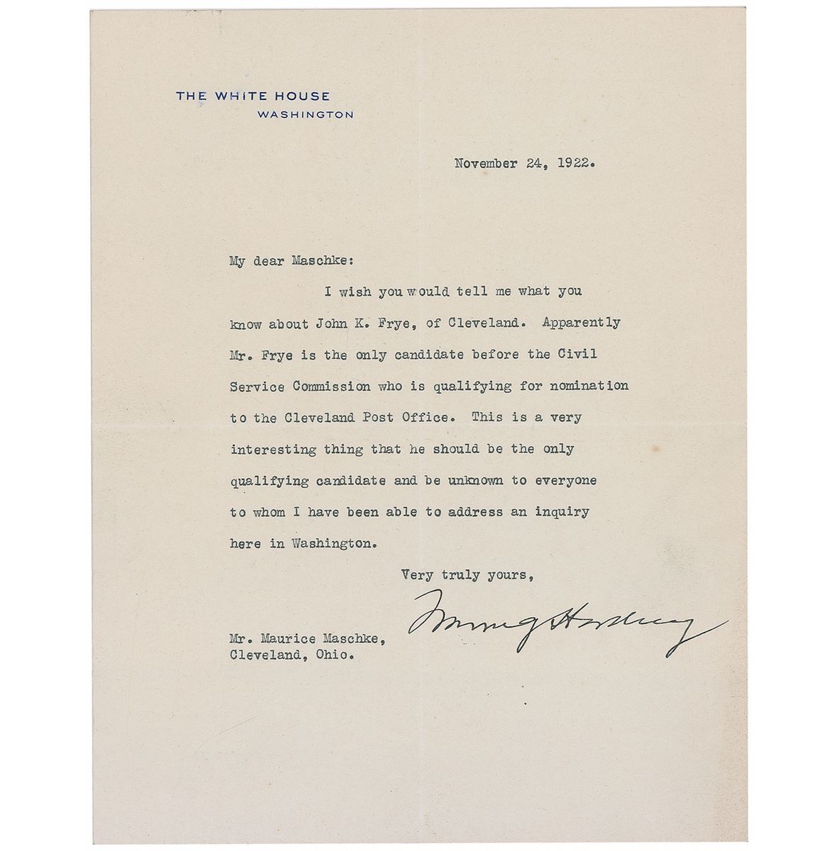 TLS as president, one page, 7 x 8.75, White House letterhead, November 24, 1922. Letter to Maurice Maschke, in full: “I wish you could tell me what you know about John K. Frye, of Cleveland. Apparently Mr. Frye is the only candidate before the Civil Service Commission who is qualifying for nomination to the Cleveland Post Office. This is a very interesting thing that he should be the only qualifying candidate and be unknown to everyone to whom I have been able to address an inquiry here in Washington.” In fine condition, with central vertical and horizontal folds (one vertical fold passing through a single letter of the signature) and a few trivial spots of foxing.