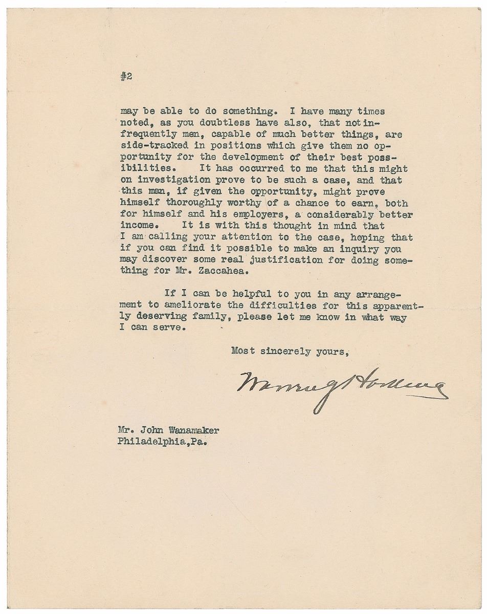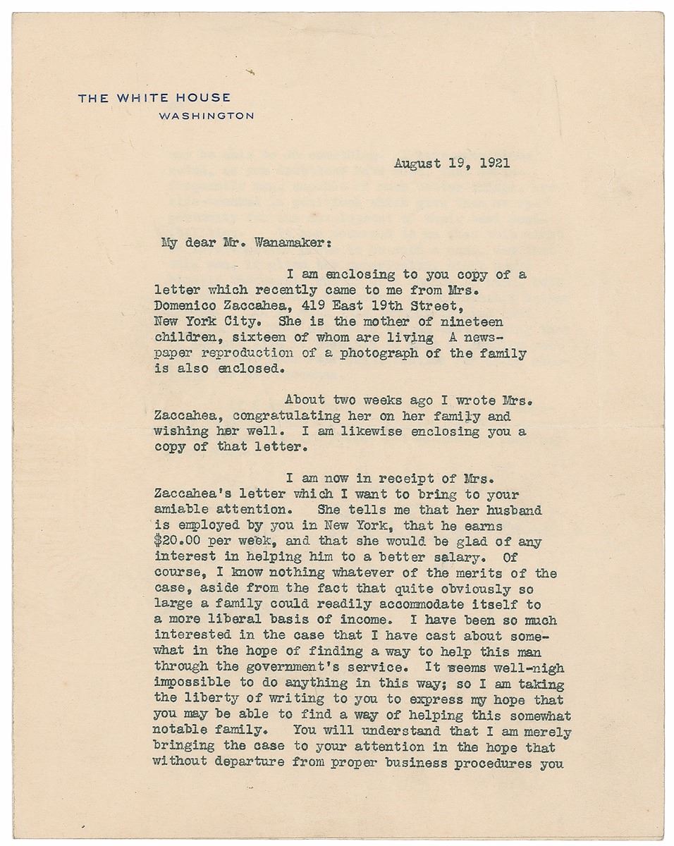 TLS as president, two pages on two adjoining sheets, 7 x 8.75, White House letterhead, August 19, 1921. Letter to former US Postmaster General John Wanamaker, in part: “I am now in receipt of Mrs. Zaccahea’s letter which I want to bring to your amiable attention. She tells me that her husband is employed by you in New York, that he earns $20.00 per week, and that she would be glad of any interest in helping him to a better salary…so I am taking the liberty of writing to you to express my hope that you may be able to find a way of helping this somewhat notable family…I have many times noted, as you doubtless have also, that not infrequently men, capable of much better things, are side-tracked in positions which give them no opportunity for the development of their best possibilities. It has occurred to me that this might on investigation prove to be such a case, and that this man, if given the opportunity, might prove himself thoroughly worthy of a chance to earn, both for himself and his employers, a considerably better income.” In fine condition, with trivial creasing and soiling.