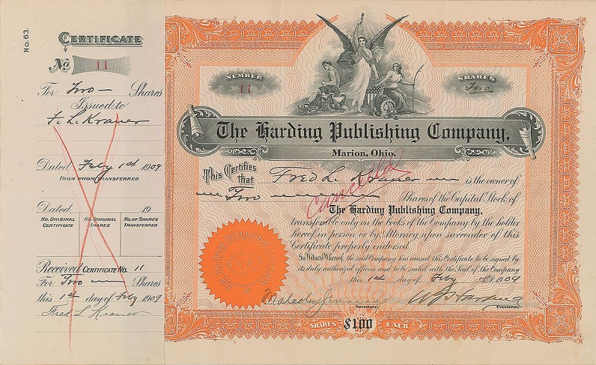 Partly-printed DS, signed “W. G. Harding,” one page, 14 x 8.5, February 1, 1909. Stock certificate issued to Fred L. Kramer for two shares in the Harding Publishing Company, signed by Harding as president of the firm. In fine condition.