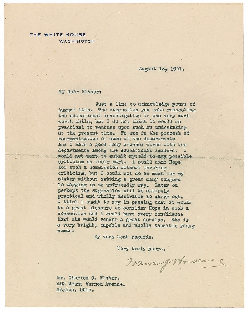 TLS as president, one page, 7 x 9, White House letterhead, August 18, 1921. Letter to Charles C. Fisher, in part: “The suggestion you make respecting the educational investigation is one very much worth while, but I do not think it would be practical to venture upon such an undertaking at the present time. We are in the process of reorganization of some of the departments and I have a good many crossed wires with the departments among the educational leaders. I would not want to submit myself to any possible criticism on their part. I could name Hope for such a commission without invoking criticism, but I could not do as much for my sister without setting a great many tongues to wagging in an unfriendly way. Later on perhaps the suggestion will be entirely practical and wholly desirable to carry out…it would be a great pleasure to consider Hope in such a collection and I would have every confidence that she would render a great service. She is a very bright, capable and wholly sensible young woman.” Archivally repaired central horizontal tear extending the full width of the letter, otherwise fine condition. Provenance: The Everett Fisher Collection.