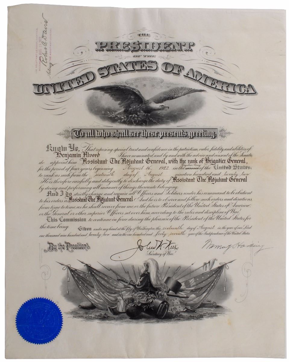 Partly-printed vellum DS as president, one page, 15.5 x 19.25, August 16, 1922. President Harding appoints Benjamin Alvord as “Assistant The Adjutant General, with the rank of Brigadier General for the period of four years beginning August 16, 1922 in the Regular Army of the United States.” Signed at the conclusion by Harding and countersigned by Secretary of War John W. Weeks. The blue seal affixed to the lower left is creased but fully intact. In fine condition, with slight creasing and scattered soiling.