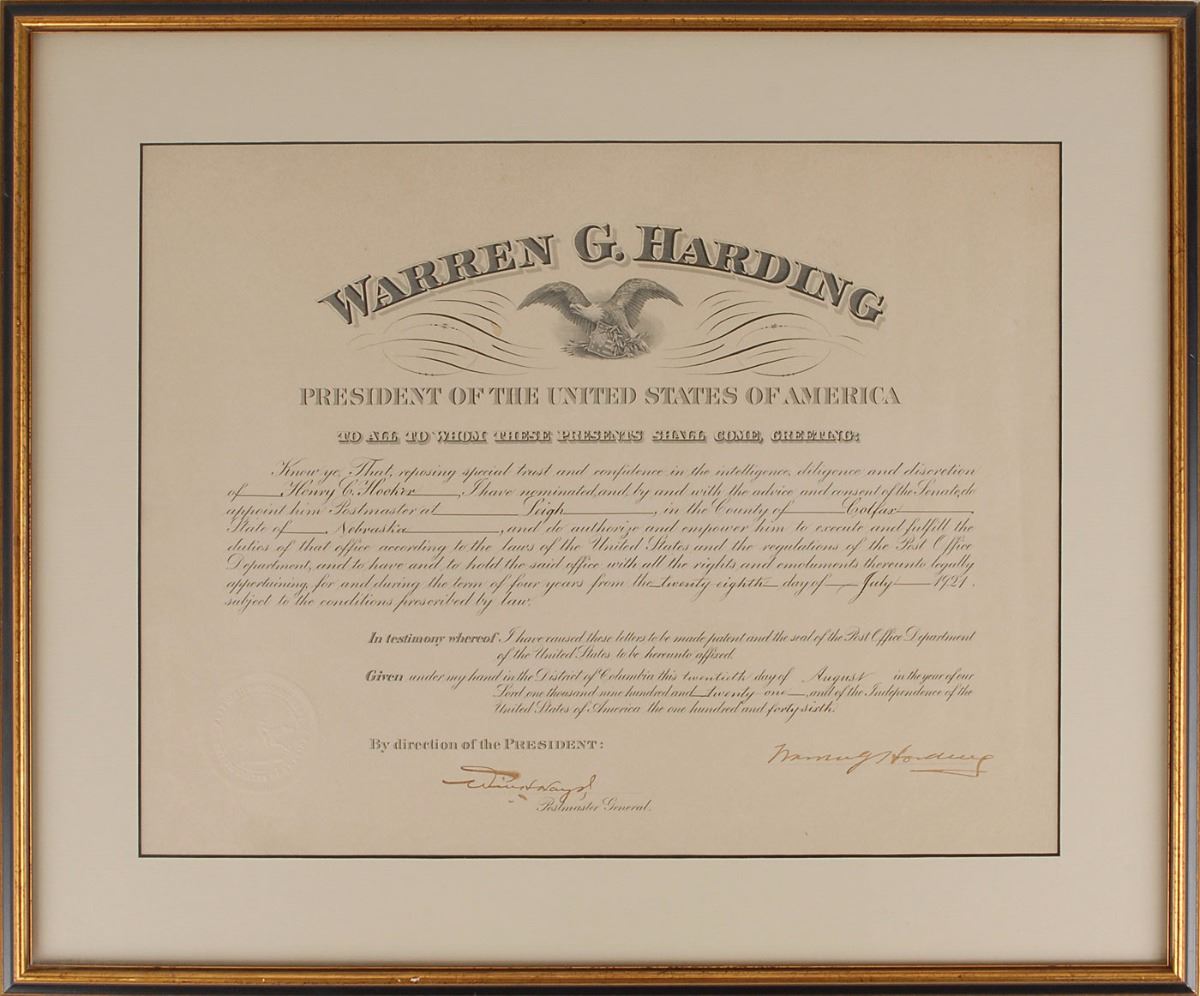 Partly-printed DS as president, one page, 17 x 13, July 28, 1921. President Harding appoints Henry C. Hooker as “Postmaster at Leigh, in the County of Colfax. State of Nebraska.” Signed at the conclusion by Harding, and countersigned by Postmaster General William H. Hays. Matted and framed. In fine condition, with some light creasing to the right side.