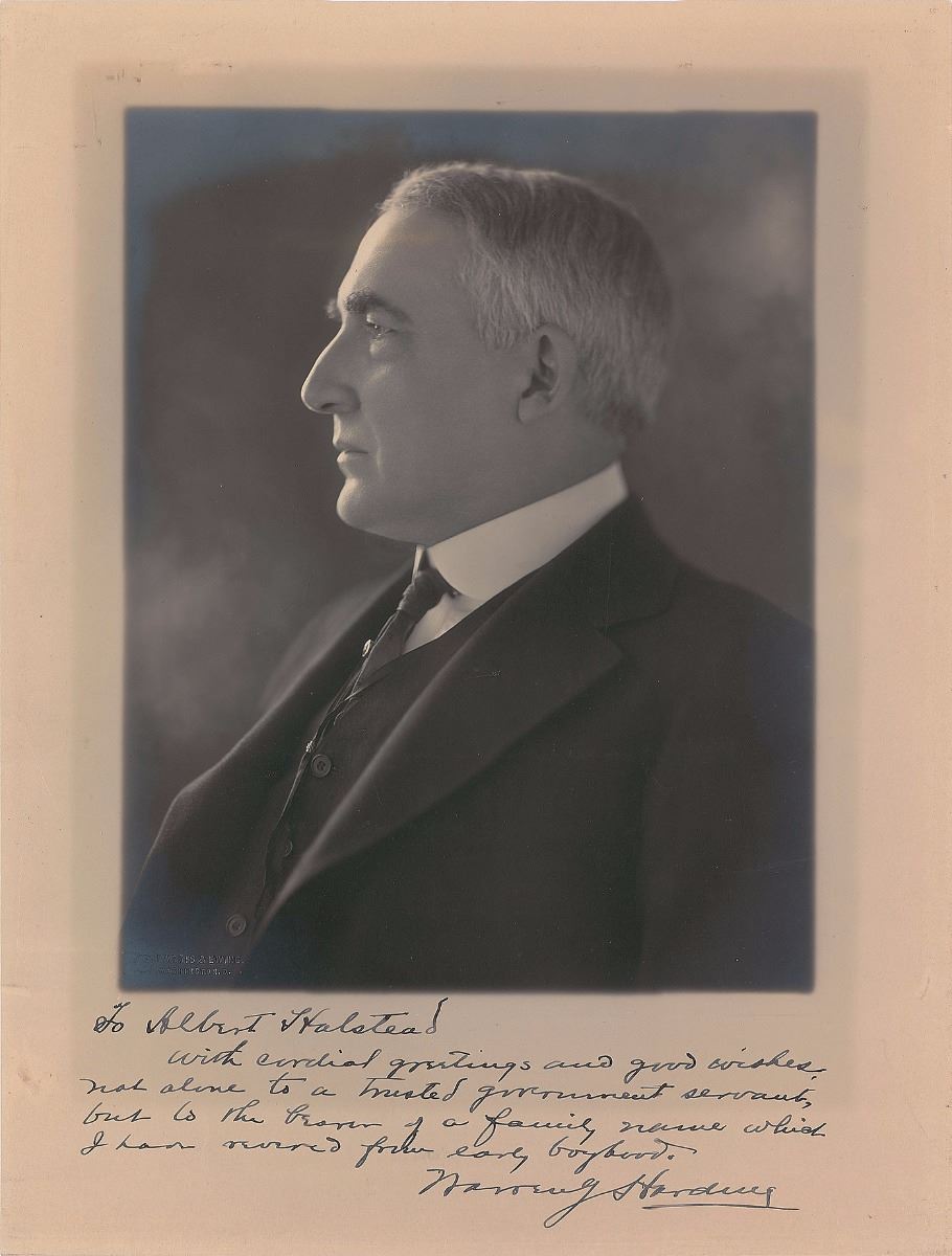 Striking matte-finish 9.75 x 13 portrait of Harding in profile, signed and inscribed in fountain pen, “To Albert Halstead, With cordial greetings and good wishes, not alone to a trusted government servant but to the bearer of a family name which I had revered from early boyhood. Warren G. Harding.” Blindstamped by Harris & Ewing. In fine condition, with trimmed edges.