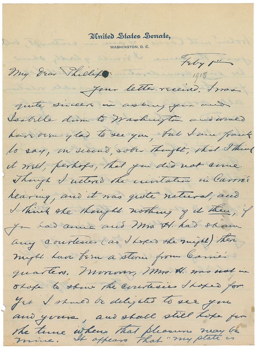 ALS signed “W. G. H.,” one page both sides, 8 x 11, United States Senate letterhead, February 1, [1918]. Letter to James Phillips, the husband of Harding’s mistress, Carrie Fulton Phillips, in full: “Your letter received. I was quite sincere in asking you and Isabelle down to Washington and would have been glad to see you, but I am frank to say, in second, sober thought, that I think it well, perhaps, that you did not come. Though I uttered the invitation in Carrie’s hearing, and it was quite natural, and I think she thought nothing of it then, if you had come and Mrs. H had shown any courtesies (as I hoped she might) there might have been a storm from Carrie’s quarters. Moreover, Mrs. H. was not in shape to show the courtesies I had hoped for. Yet I should be delighted to see you and yours, and shall still hope for the time when that pleasure may be mine. It appears that ‘my plate is broken’ with Carrie. I am in contempt, but just the same I would gladly show her every consideration, and still hope for the day when agreeable relations all around can be reasonably be [sic] restored. I think it possibly. [sic] It would have been done ere this if ‘undiplomatic’ things had not been said. Give my very best to Isabelle and tell her if she comes this way to be sure to let me know. I should be proud to show her attention. She is an admirable and adorable young woman. Of course if you come you will let me know. I’ll gladly welcome you.” Intersecting folds, binding dings to left edge, an ink blot to the salutation, and some staining to the reverse, otherwise fine condition.