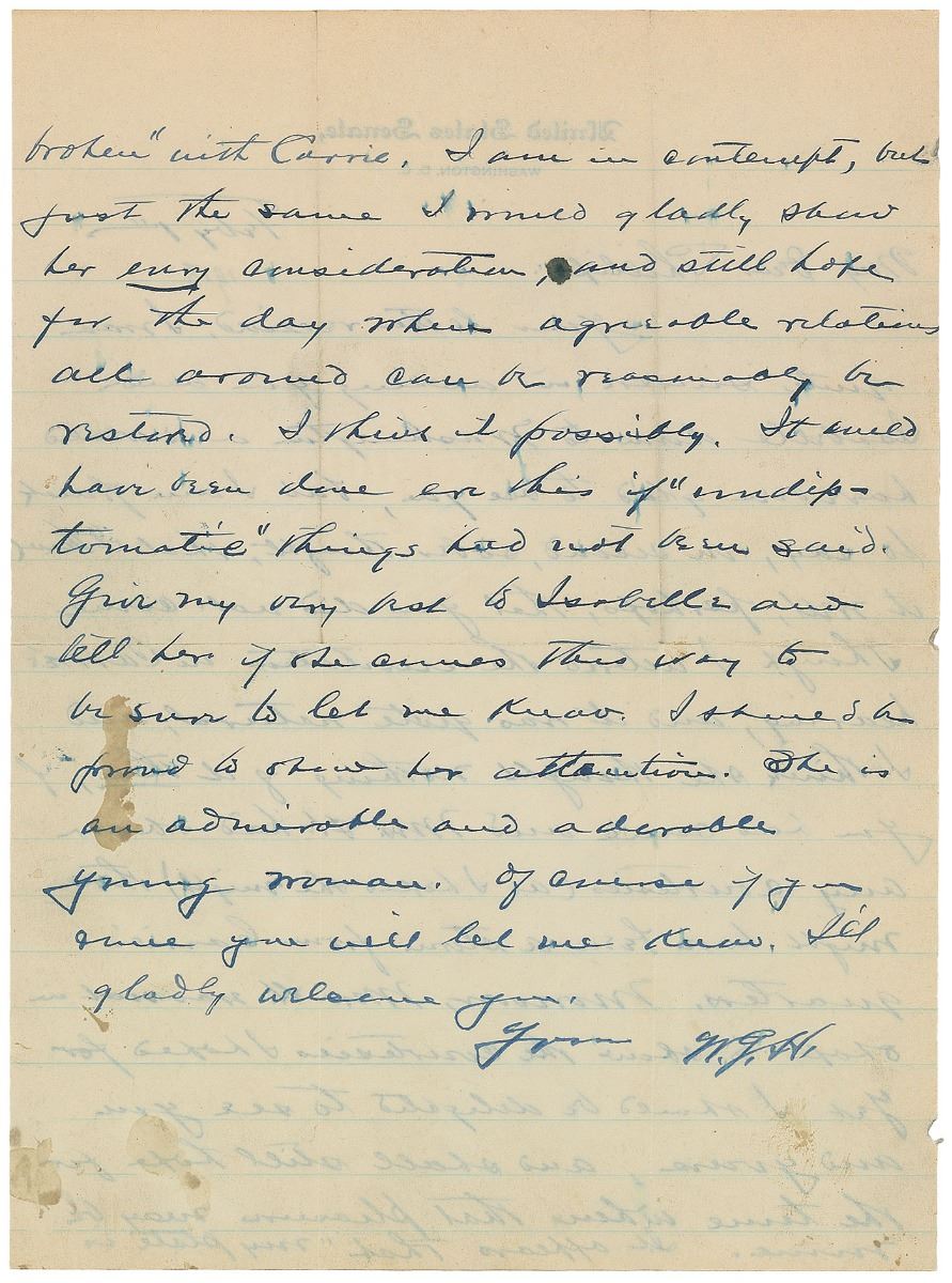 James Phillips was a successful storeowner and member of the Marion social elite, along with Warren G. Harding and his wife Florence, who became very close with Phillips’s wife Carrie almost immediately. Following the loss of the Phillips’ two-year-old son, a grieving Carrie turned to Warren for consolation, sparking an on-again, off-again affair that would last throughout Harding’s terms as senator. When Carrie threatened to expose the details of their affair during his 1920 campaign for the presidency, the Republican Party wilted to her demands—a fully financed tour of Asia and the Pacific Islands, and an annual stipend for the remainder of her life. With both betrayed spouses aware of the affair, this letter shows Harding, “in second, sober thought,” withdrawing a recent invitation to the Phillips family, and deflecting blame on Florence with the suggestion that she “was not in the shape” for such courtesy. An odd and revealing letter from a man whose unburied scandals would later rock his brief presidential legacy.