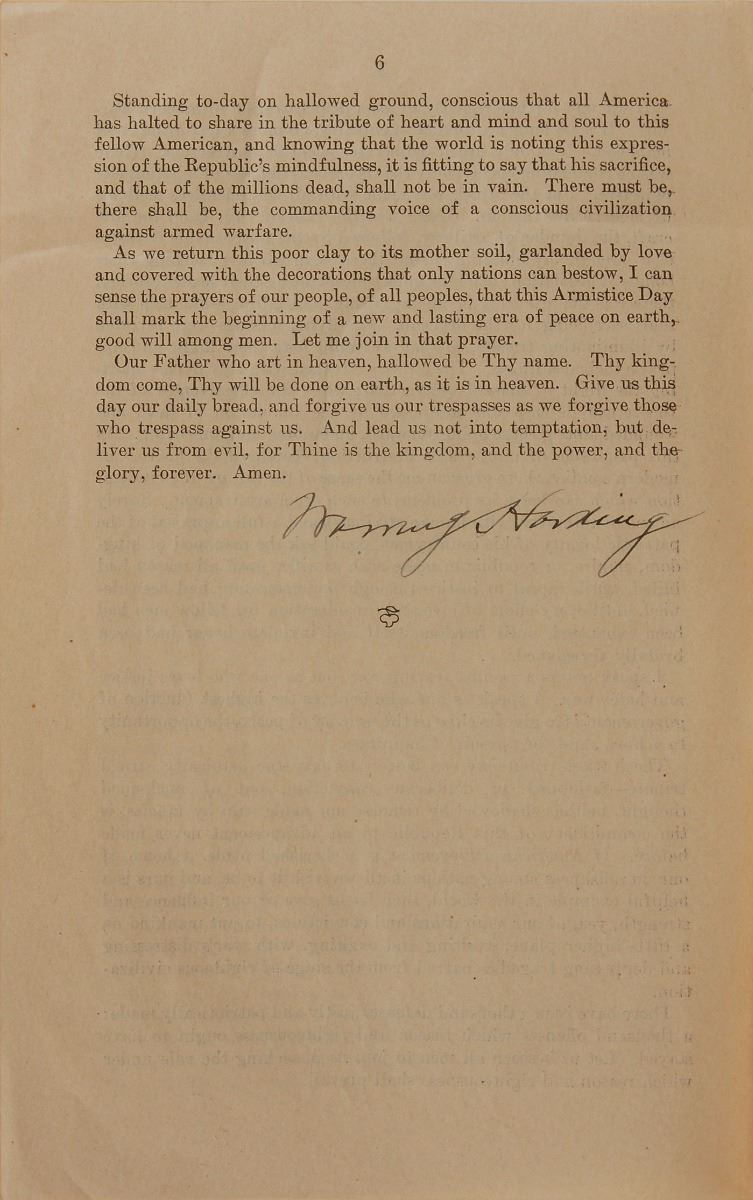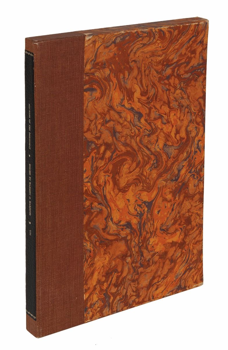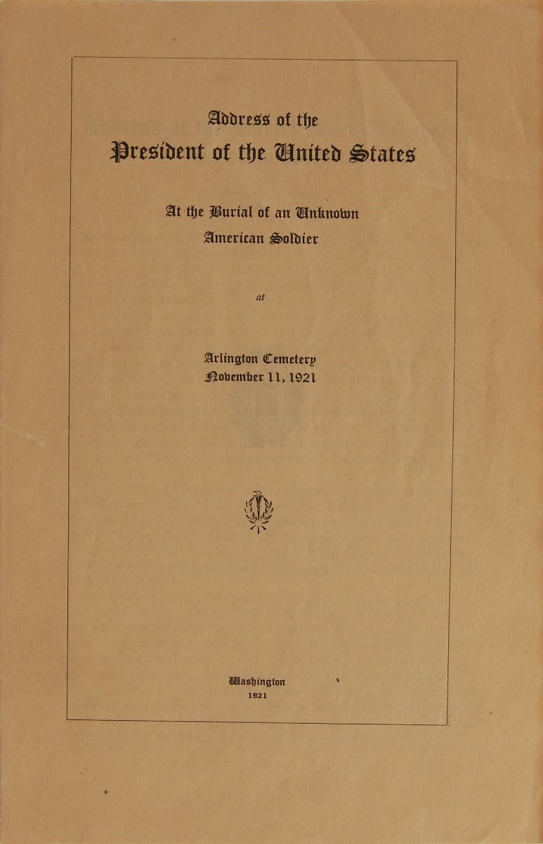 Signed booklet: Address of the President of the United States at the Burial of an Unknown American Soldier at Arlington Cemetery, November 11, 1921. Washington: Government Printing Office, 1921. Paper wrappers, 5.75 x 9, six pages. Signed on the last page in crisp fountain pen, “Warren G. Harding.” In very good to fine condition, with scattered light creasing, a small tear to the left margin of the cover page, and a short separation at the top of the spine. Accompanied by a gorgeous custom-made slipcase.