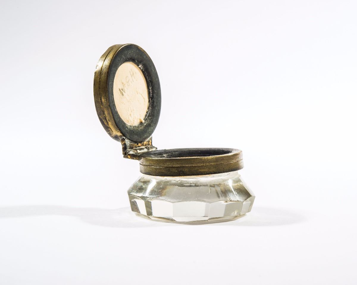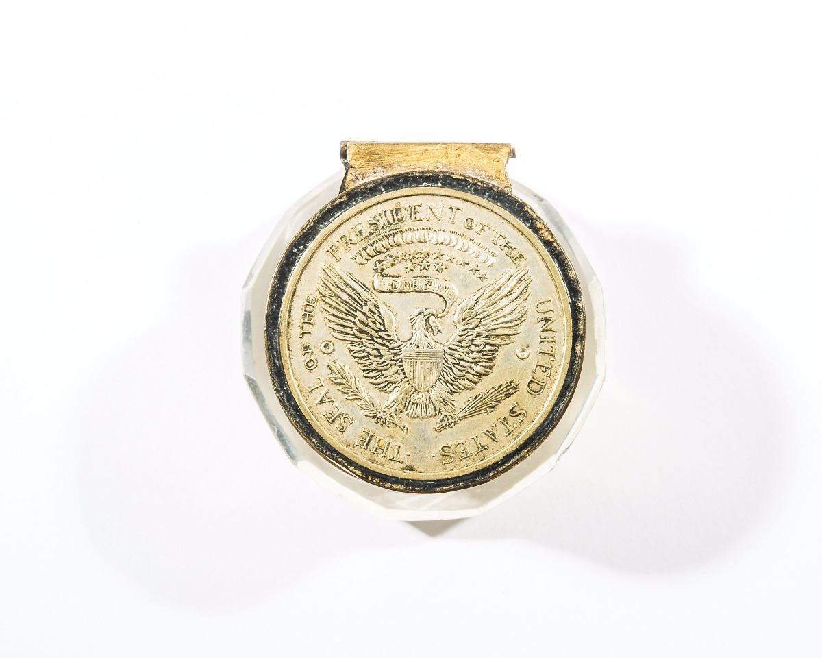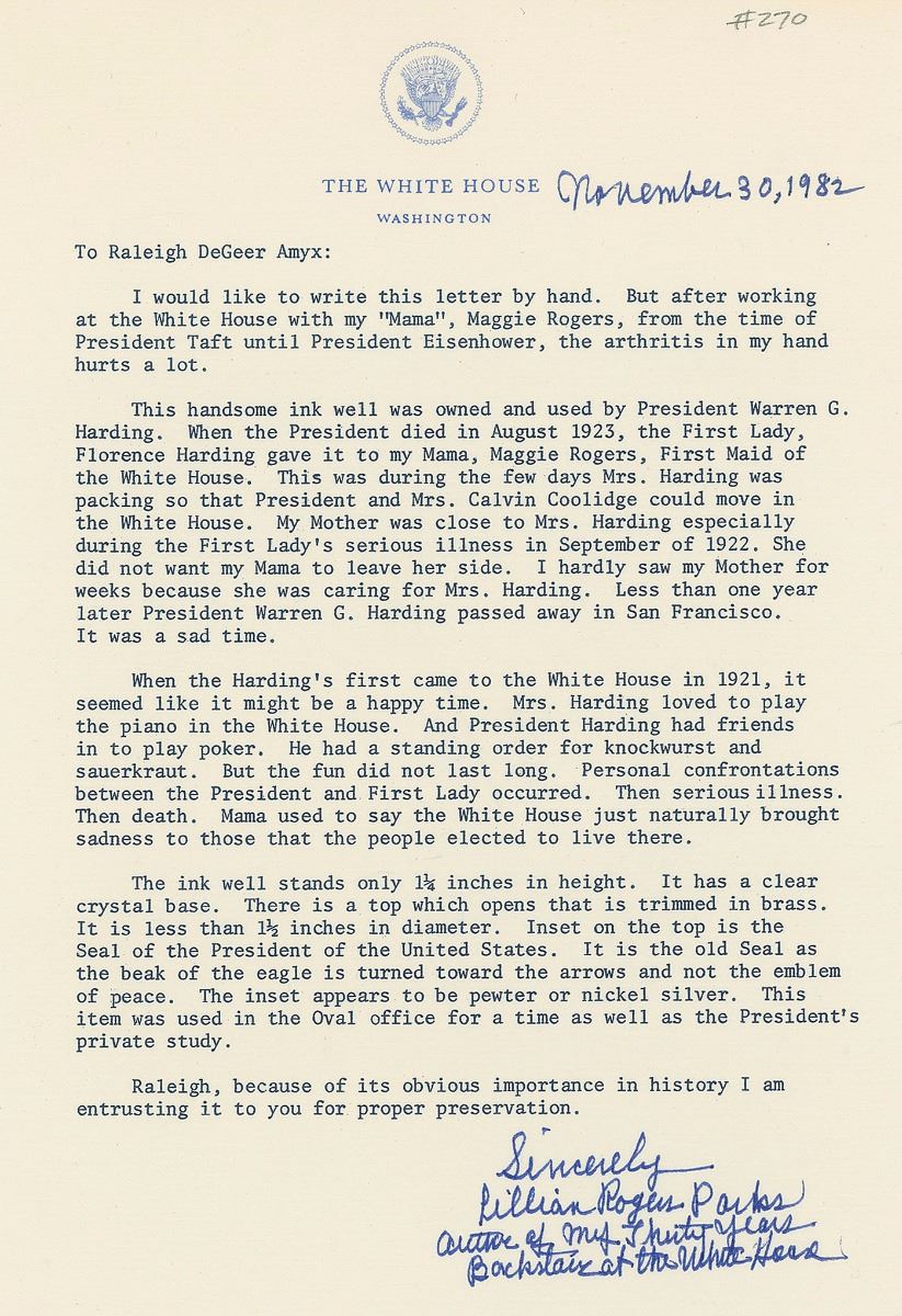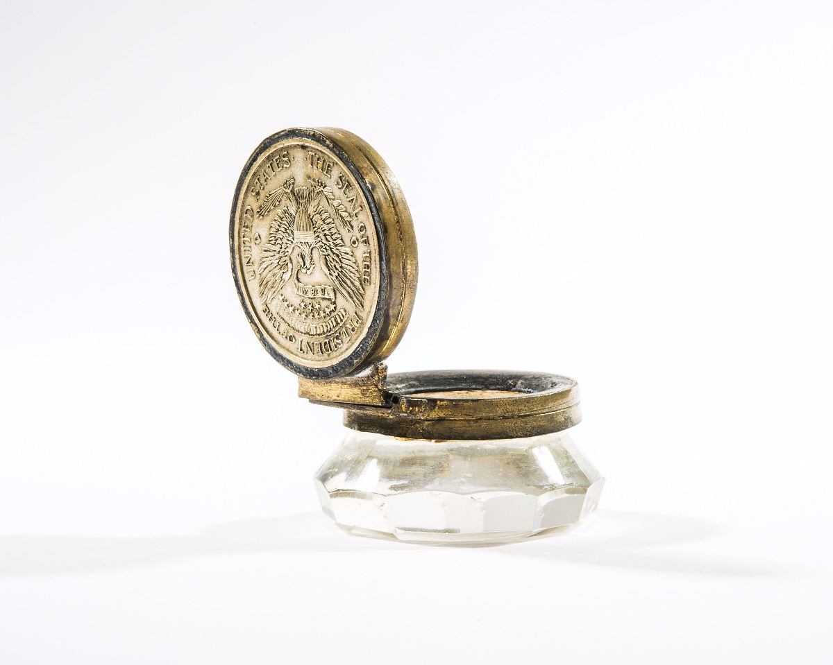 President Harding’s personally-owned and -used ink well, presented by Florence Harding to White House maid Maggie Rogers after the president’s passing. Stunning ink well stands 1.25? high, has a clear crystal base, and a metal top (pewter or nickel-silver), trimmed in brass, which bears the older version of the Seal of the President of the United States. Accompanied by a 1982 detailed letter of provenance, on White House letterhead, by Lillian Rogers Parks, who was a best selling author as well as housekeeper and seamstress at the White House for over 30 years, from President Hoover through President Eisenhower. Letter reads, in part: “This handsome ink well was owned and used by President Warren G. Harding. When the President died in August 1923, the First Lady, Florence Harding gave it to my Mama, Maggie Rogers, First Maid of the White House. This was during the few days Mrs. Harding was packing so that President and Mrs. Calvin Coolidge could move into the White House…This item was used in the Oval Office for a time as well as the President’s private study.” In fine condition, with expected light wear. An exemplary presidential relic intended for a collector with exquisite taste. From the Raleigh DeGeer Amyx Collection.