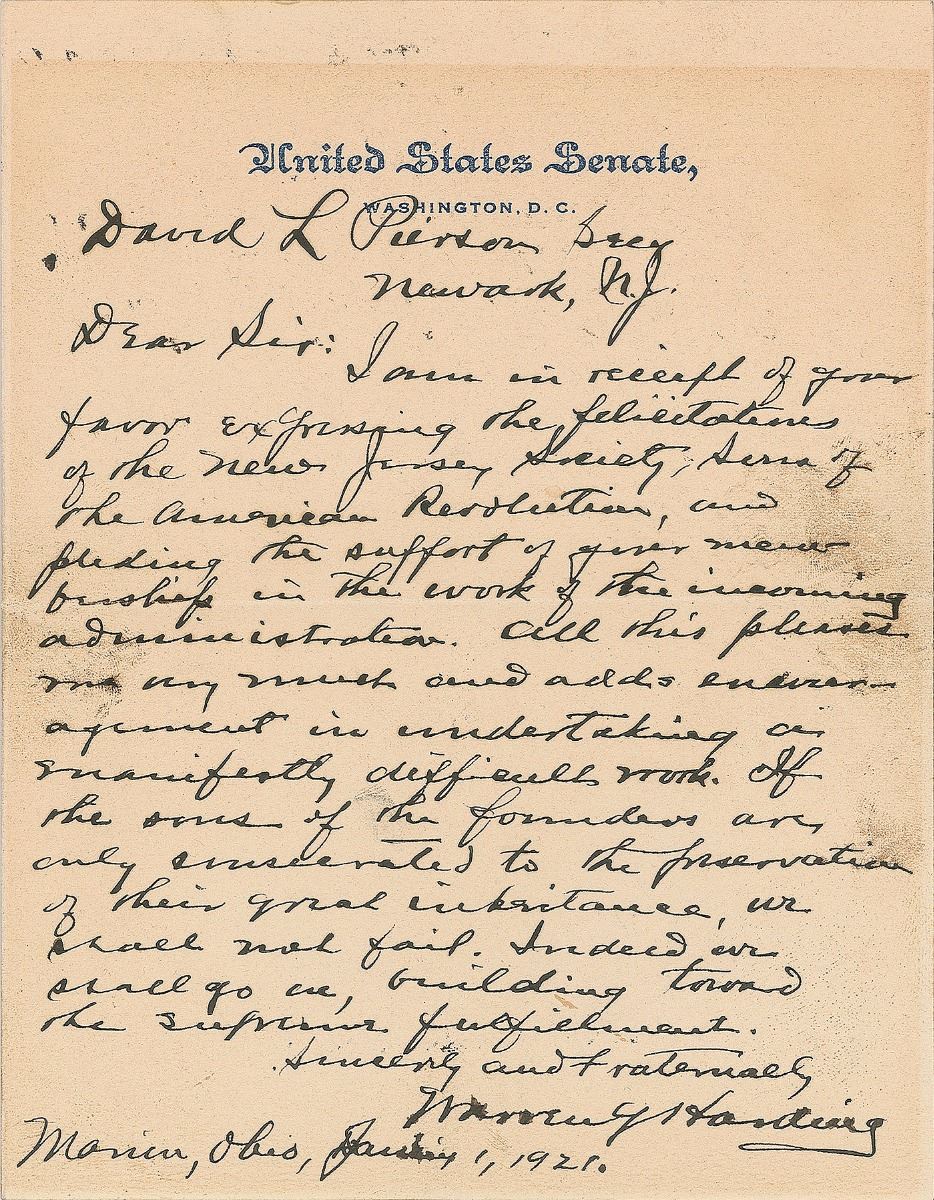 ALS as president-elect, one page, 5.25 x 6.75, United States Senate letterhead, January 1, 1921. Written from Marion, Ohio, a letter to David L. Pierson, in full: "I am in receipt of your favor expressing the felicitations of the New Jersey Society, Sons of the American Revolution, and pled[g]ing the support of your membership in the work of the incoming administration. All this pleases me very much and adds encouragement in undertaking a manifestly difficult work. If the sons of the founders are only consecrated to the preservation of their great inheritance, we shall not fail. Indeed we shall go on, building toward the supreme fulfillment." In fine condition, with a light block of uniform toning from prior display. Accompanied by the original mailing envelope. On Tuesday, November 2, 1920, the Republican ticket of Harding and Calvin Coolidge won the presidential election in a landslide over Democrat James M. Cox and his running mate Franklin D. Roosevelt. Founded in 1889, the Sons of the American Revolution is a national patriotic society of direct descendants of soldiers or sailors who served in the American Revolution.