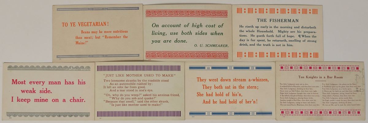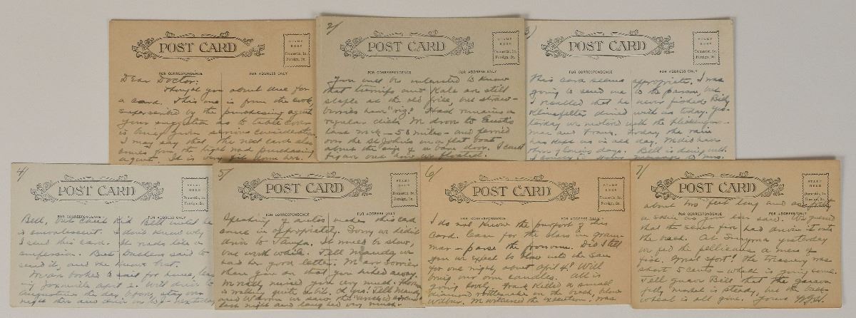 Unusual ALS signed “W. G. H.,” seven pages on humorous 5.5 x 3.5 postcards, no date. Letter to his personal physician Charles E. Sawyer, in which Harding occasionally comments on the subject of the postcard. In part: "Thought you about due for a card. This one is from the cook, superscribed by the purchasing agent…I may say that the next card also comes from the tight wad purchasing agent…You will be interested to know that turnips and kale are still staple at the old grill…This card seems appropriate. I was going to send one to the parson, but I recalled that he never fished…Yesterday we motored with the Flickingers—Mae and Frank. Today the rain has kept us in all day. We did have three glorious days…I don't know why I send this card. It reads like a confession. But Duchess [his wife, Florence Harding] said to send it, and she knows best. We are booked to sail for Lima, leaving Jaxonville April 2…I do not know the purpose of this card. Case for the class in grammar—parse the pronoun…All is going lovely. Frank killed a small diamond rattlesnake on the beach…We witnessed the execution! Was about two feet long and as pretty a skin as you ever saw." In fine condition.