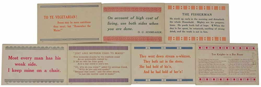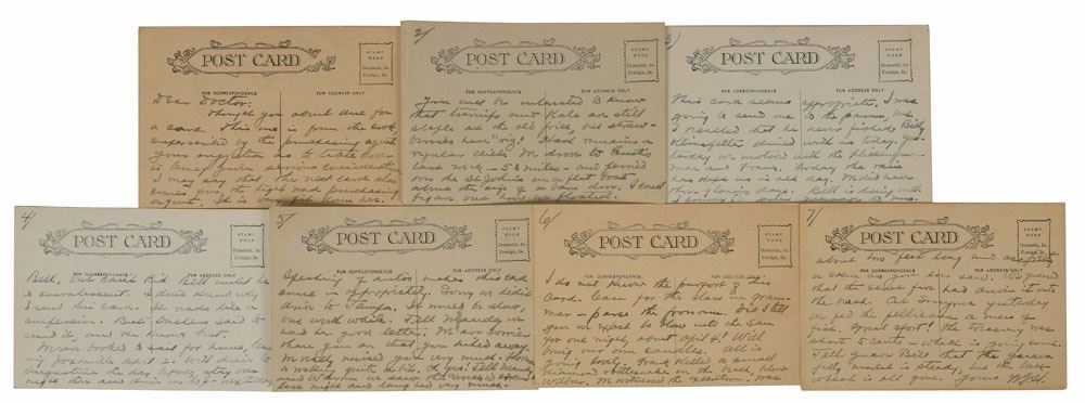 Unusual ALS signed “W. G. H.,” seven pages on humorous 5.5 x 3.5 postcards, no date. Letter to his personal physician Charles E. Sawyer, in which Harding occasionally comments on the subject of the postcard. In part: "Thought you about due for a card. This one is from the cook, superscribed by the purchasing agent…I may say that the next card also comes from the tight wad purchasing agent…You will be interested to know that turnips and kale are still staple at the old grill…This card seems appropriate. I was going to send one to the parson, but I recalled that he never fished…Yesterday we motored with the Flickingers—Mae and Frank. Today the rain has kept us in all day. We did have three glorious days…I don't know why I send this card. It reads like a confession. But Duchess [his wife, Florence Harding] said to send it, and she knows best. We are booked to sail for Lima, leaving Jaxonville April 2…I do not know the purpose of this card. Case for the class in grammar—parse the pronoun…All is going lovely. Frank killed a small diamond rattlesnake on the beach…We witnessed the execution! Was about two feet long and as pretty a skin as you ever saw." In fine condition.