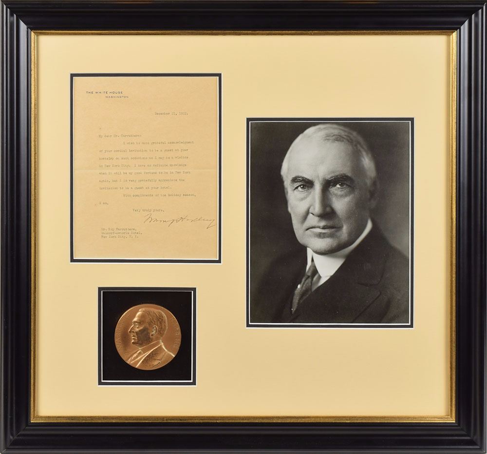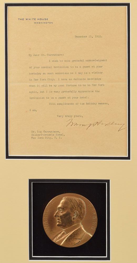 TLS as president, one page, 6.25 x 8.25, White House letterhead, December 21, 1922. Letter to Roy Carruthers of the Waldorf-Astoria, in part: "I wish to make grateful acknowledgment of your cordial invitation to be a guest at your hostelry on such occasions as I may be a visitor in New York City. I have no definite knowledge when it will be my good fortune to be in New York again, but I do very gratefully appreciate the invitation to be a guest at your hotel." Nicely double-matted and framed with a medal and portrait to an overall size of 21.75 x 20.25. In fine condition, with uniform overall toning.