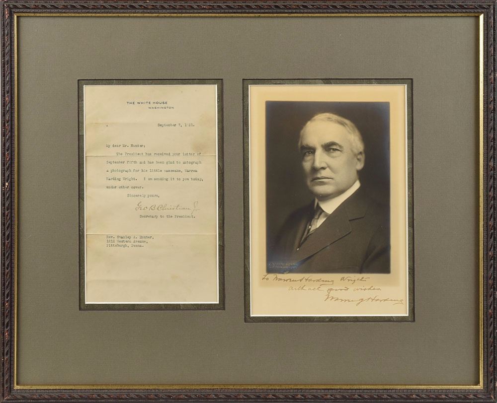 Vintage matte-finish 6.25 x 9.25 portrait of President Harding by Harris & Ewing, signed and inscribed in the lower border in fountain pen, "To Warren Harding Wright, with all good wishes, Warren G. Harding.” Blindstamped in the lower left by the photography studio. Double-matted and framed with a transmittal letter from White House Secretary George B. Christian, Jr., to an overall size of 20 x 16.25; the letter, dated September 7, 1921, in part: "The President has received your letter of September fifth and has been glad to autograph a photograph for his little namesake." In fine condition, with soiling to the transmittal letter.