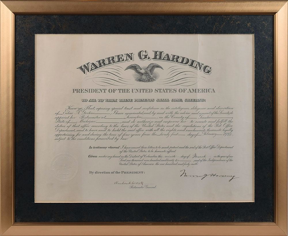 Partly-printed DS as president, one page, 17 x 13, March 9, 1922. President Harding appoints Edna A. Gorton as "Postmaster at Lexington, in the County of Sanilac, State of Michigan." Boldly signed at the conclusion by President Harding and countersigned by Postmaster General Hubert Work. Matted and framed to an overall size of 22.5 x 18.5. In fine condition, with a vertical crease to the right side.