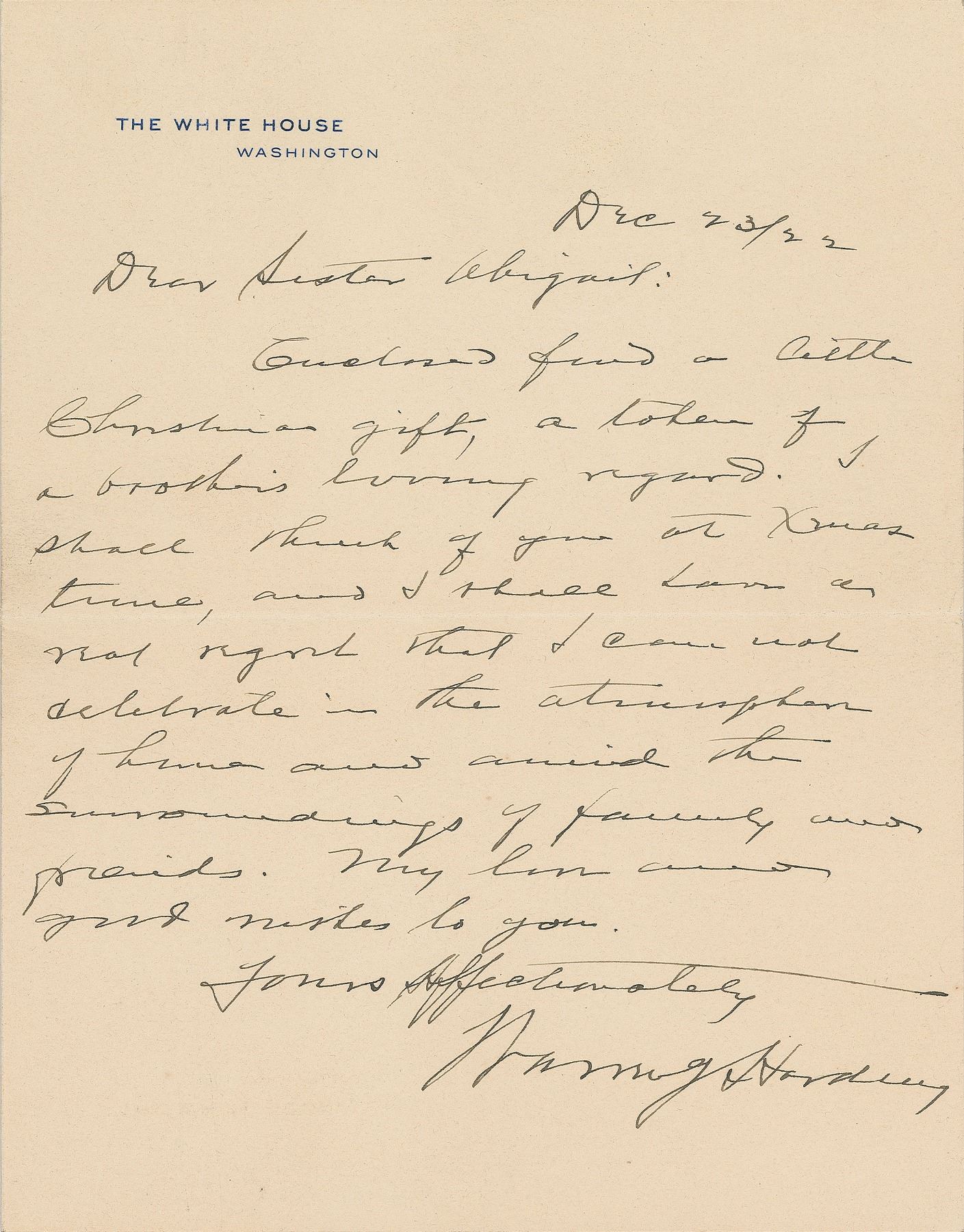 ALS as president, one page, 7 x 9, White House letterhead, December 23, 1922. Letter to his sister Abigail, in full: "Enclosed find a little Christmas gift, a token of a brother's loving regard. I shall think of you at Xmas time, and I shall have a real regret that I can not celebrate in the atmosphere of home and amid the surroundings of family and friends. My love and good wishes to you." In fine condition. Accompanied by the original White House mailing envelope. A heartfelt missive between siblings that reveals Harding’s disappointment in not being able to spend the holidays with his friends and family back in Ohio; his wife, Florence, had collapsed from kidney failure the September prior and was still confined to a wheelchair. This would be the second and last Christmas Harding celebrated as president. Handwritten letters from Harding as commander-in-chief—especially those bearing familial content— remain exceedingly rare and sought-after.