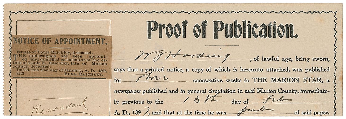Partly-printed DS, signed “W. G. Harding,” one page, 7.75 x 2.5, February 13, 1897. Partial proof of publication, in full: "W. G. Harding, of lawful age, being sworn, says that a printed notice, a copy of which is hereunto attached, was published for three consecutive weeks in The Marion Star, a newspaper published and in general circulation in said Marion County, immediately previous to the 13th day of Feb A. D., 1897, and that at the time he was pub of said paper." The referenced notice is attached to left border. In fine condition.