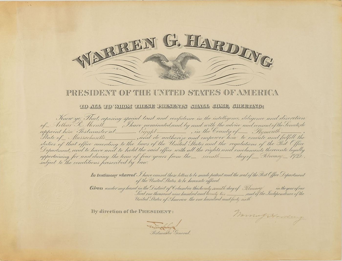 Partly-printed DS as president, one page, 18 x 14, February 27, 1922. President Harding appoints Arthur R. Merritt as a "Postmaster at Egypt, in the County of Plymouth, State of Massachusetts." Signed at the conclusion by Harding, and countersigned by Postmaster General William H. Hays. Lower left embossed with the Post Office Department stamp. Rolled and in very good to fine condition, with edge toning and light creasing, and some mounting remnants on the reverse.