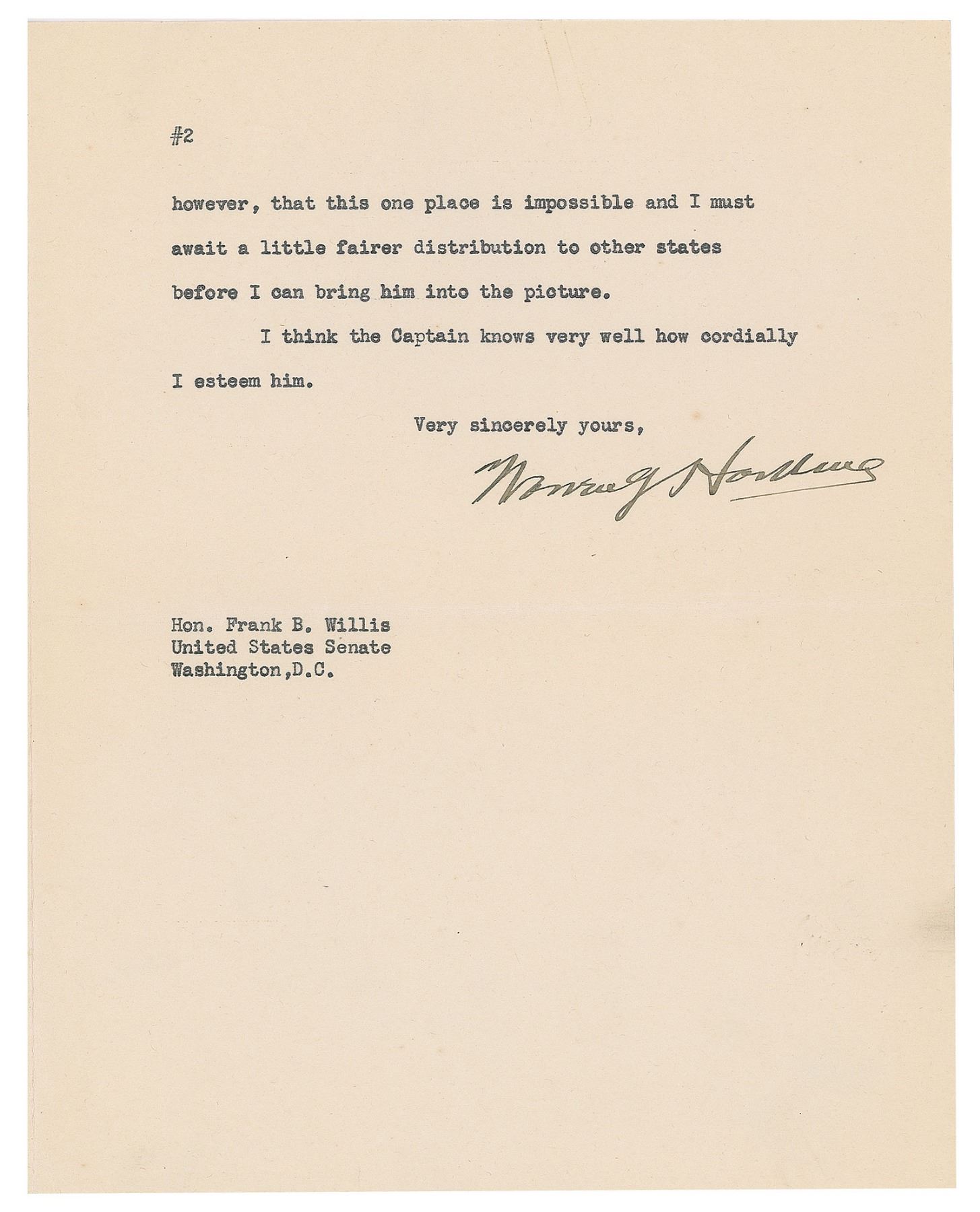 Uncommon TLS as president, two pages on two adjoining sheets, 7 x 8.75, White House letterhead, April 14, 1921. Letter to Senator Frank B. Willis, in part: "You are authorized to say that the Executive is very anxious to grant becoming recognition to Captain Heintz. I feel that it is due him and I hold him in such high esteem personally that I shall find pleasure in making a suitable bestowal of appointment. It is impossible, however, to make Captain Heintz Commissioner of Internal Revenue. I could not be justified in placing this appointment in Ohio when there are so many other states without recognition in the way of high-class appointments. You are doubtless aware that I am already criticized by the tendency to see Ohio before all other states when matters of patronage are before me. I am trying to do the thing in a considerate way, and a little later on will find some acceptable recognition of the services of Captain Heintz." In fine condition, with a small paperclip impression to the top edge.