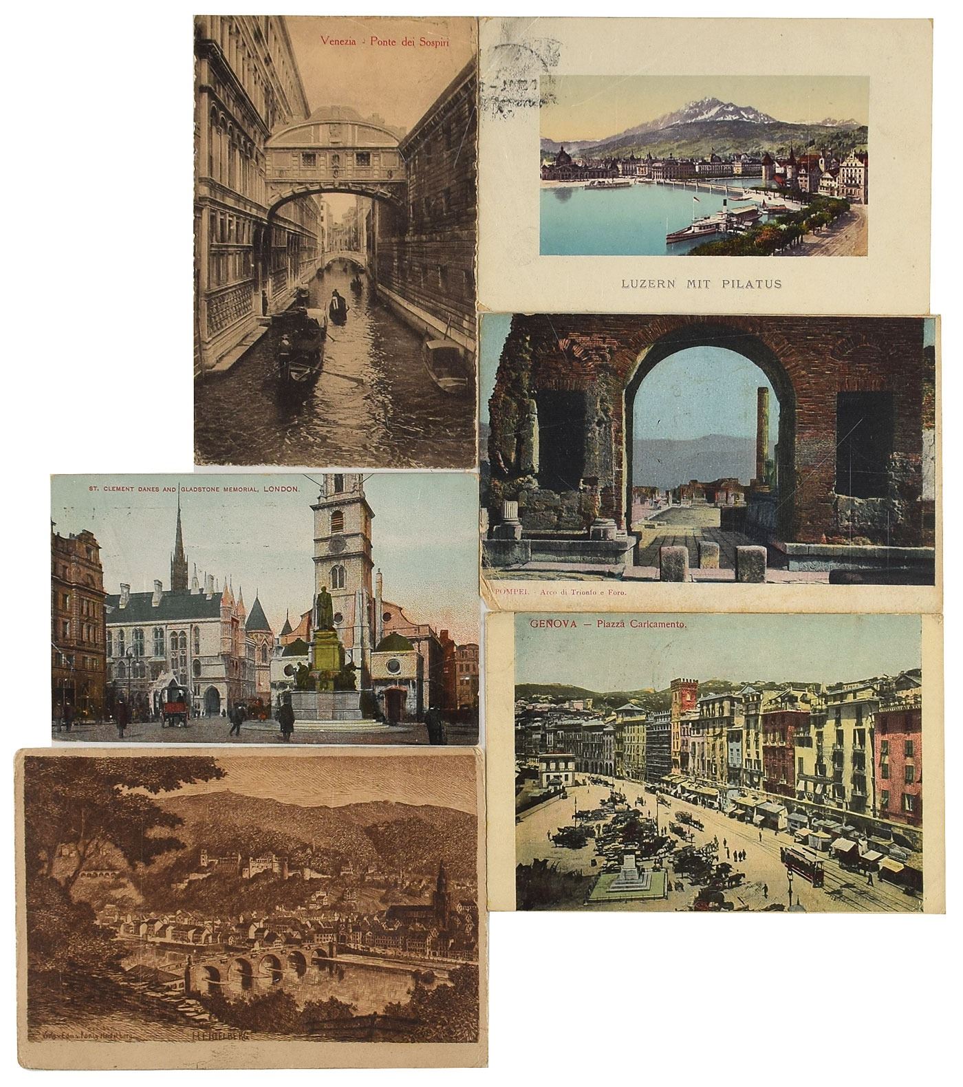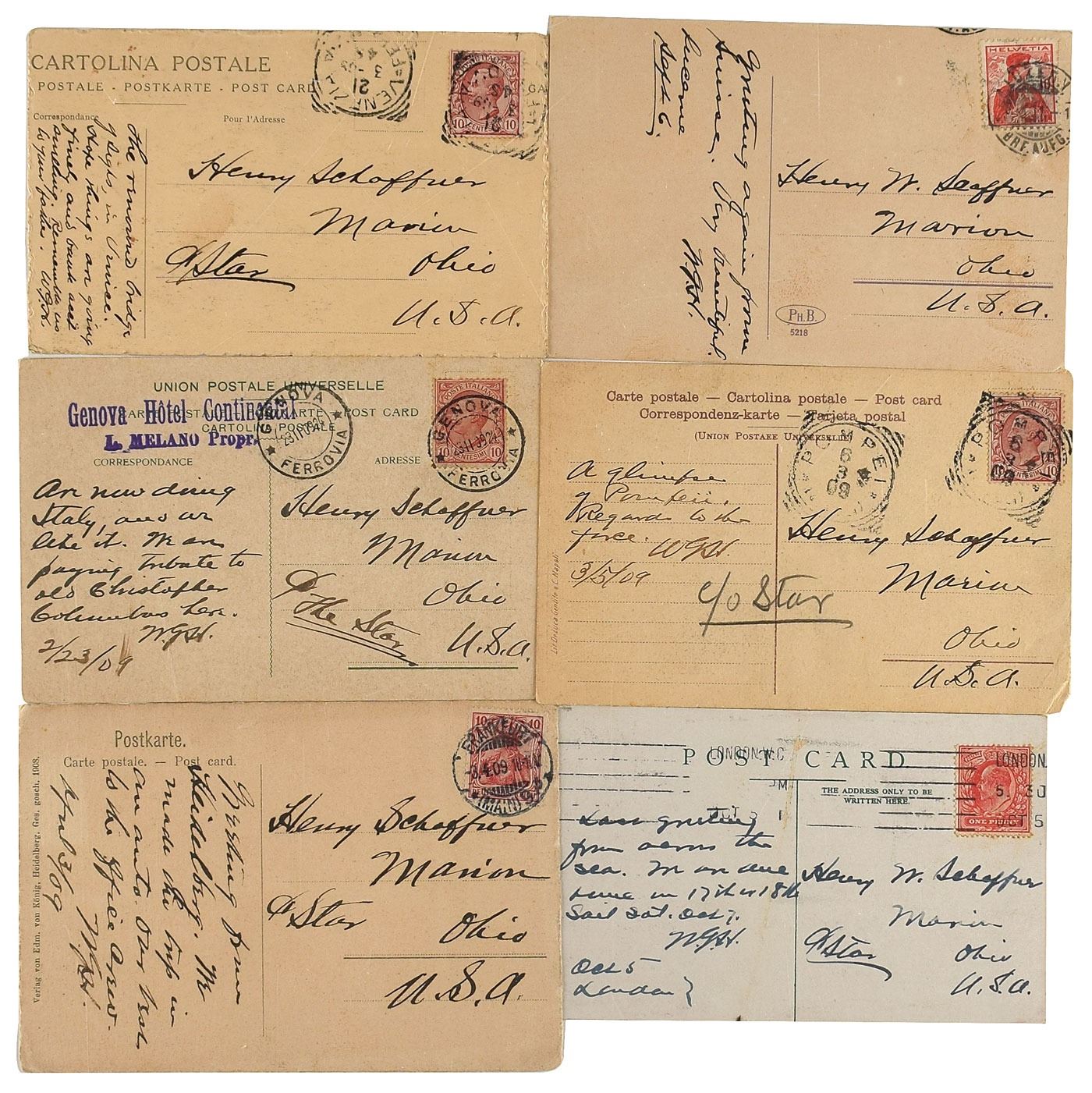 Group of six postcards with ANSs by Harding, each signed with his initials, "W. G. H.," all sent home from Europe to Henry R. Schaffner, general business manager of The Marion Star, from February to September 1909. Harding writes, in part: "Are now doing Italy, and we like it. We are paying tribute to Christopher Columbus here"; "A glimpse of Pompeii"; "The renowned bridge of sighs, in Venice. Hope things are going finely and bank acct swelling"; "Greeting from Heidelberg. We made the trip in an auto. Our best to the office crew"; "Greeting again from Suisse"; and "Last greeting from across the sea. We are due home on 17th or 18th." In fine condition.