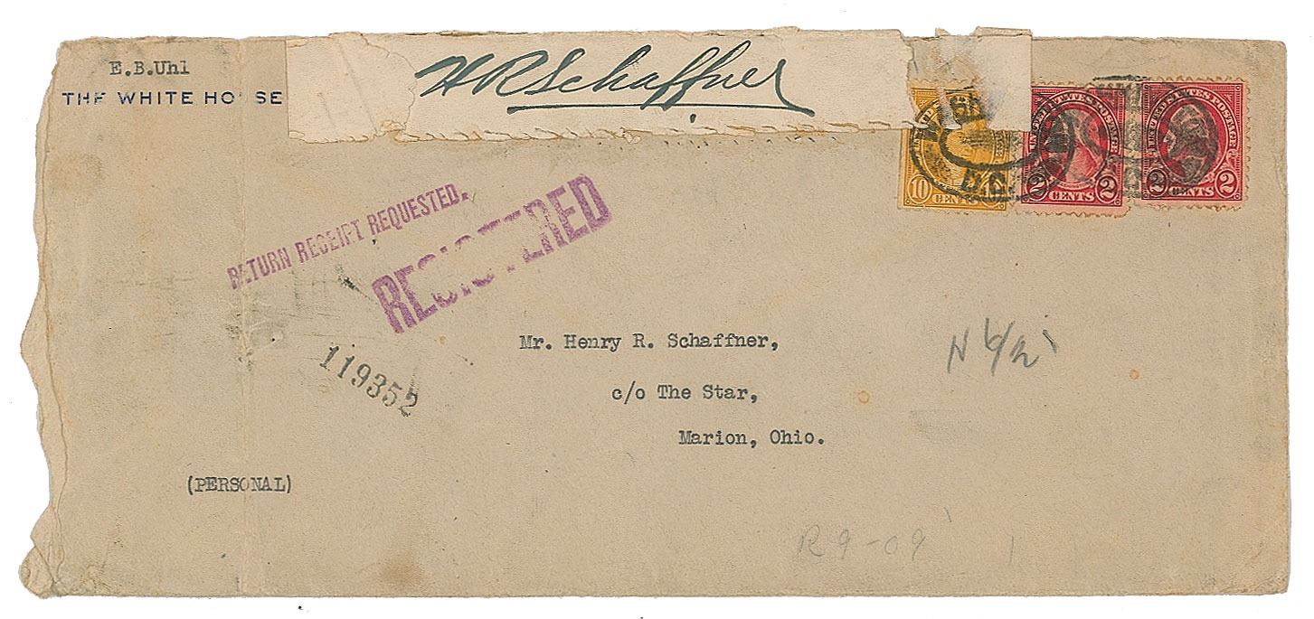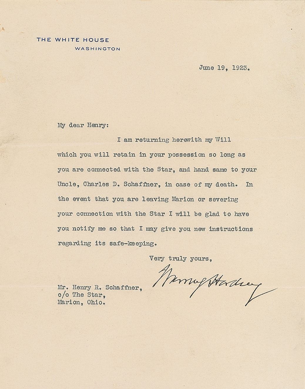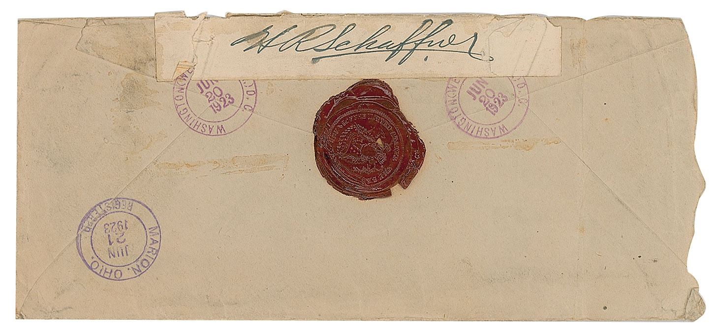 TLS as president, one page, 7 x 8.75, White House letterhead, June 19, 1923. Letter to Henry R. Schaffner, general business manager of The Marion Star, in full: "I am returning herewith my Will which you will retain in your possession so long as you are connected with the Star, and hand same to your Uncle, Charles D. Schaffner, in case of my death. In the event that you are leaving Marion or severing your connection with the Star I will be glad to have you notify me so that I may give you new instructions regarding its safe-keeping." In fine condition. Accompanied by the original mailing envelope, bearing a red wax seal on the reverse impressed with the presidential seal. Harding bought the Ohio daily newspaper The Marion Daily Star in 1884, and held ownership of the paper until mid-1923—the White House announced President Harding's sale of The Star on the next day, June 20, 1923. Harding soon fell ill, and passed away six weeks later on August 2, 1923.