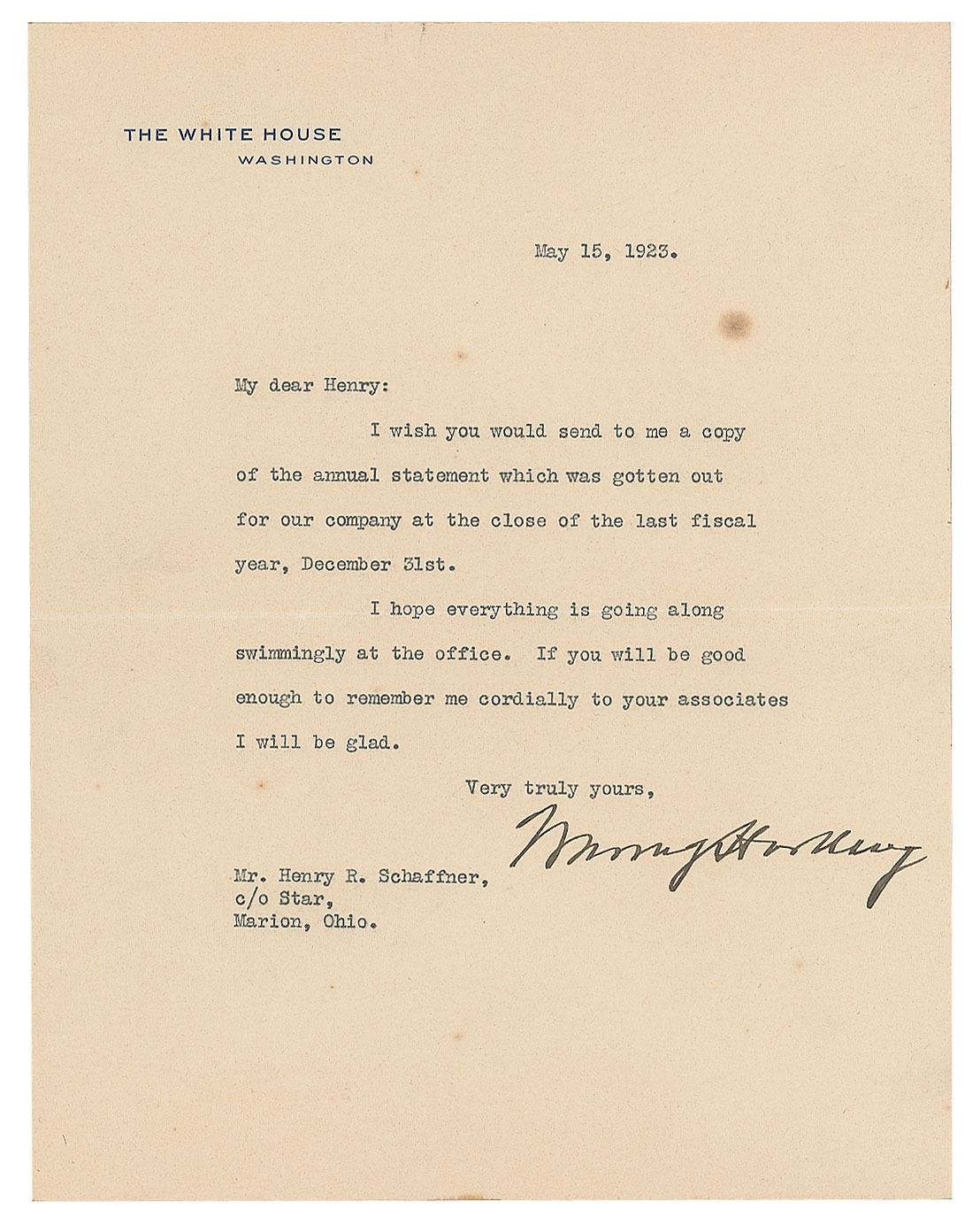 TLS as president, one page, 7 x 8.75, White House letterhead, May 15, 1923. Letter to Henry R. Schaffner, general business manager of The Marion Star, in full: "I wish you would send to me a copy of the annual statement which was gotten out for our company at the close of the last fiscal year, December 31st. I hope everything is going along swimmingly at the office. If you will be good enough to remember me cordially to your associates I will be glad." In fine condition, with a couple of small spots. Harding bought the Ohio daily newspaper The Marion Daily Star in 1884, and held ownership of the paper until mid-1923—the White House announced President Harding's sale of The Star on June 20, 1923, just over a month after he sent the present letter.