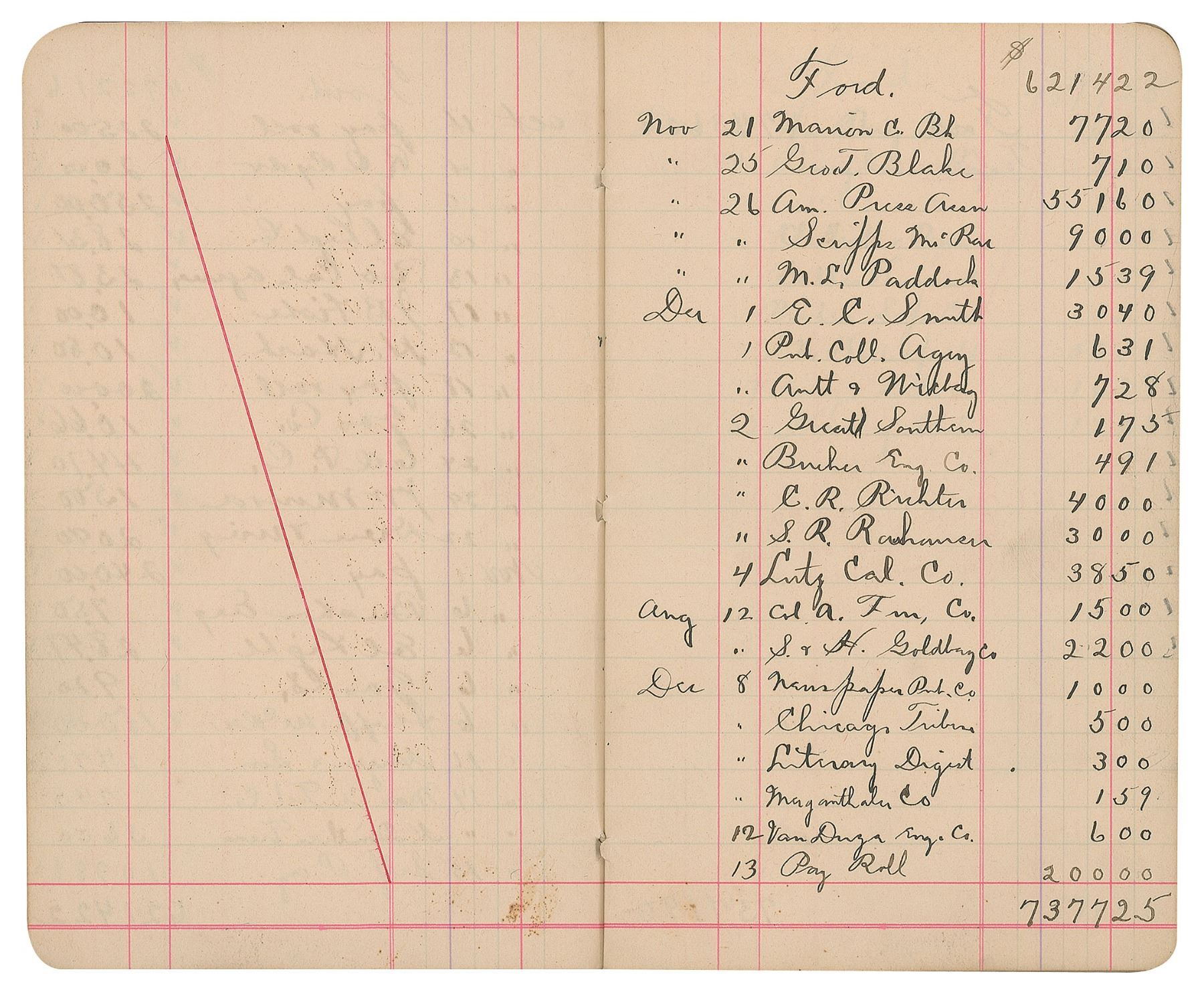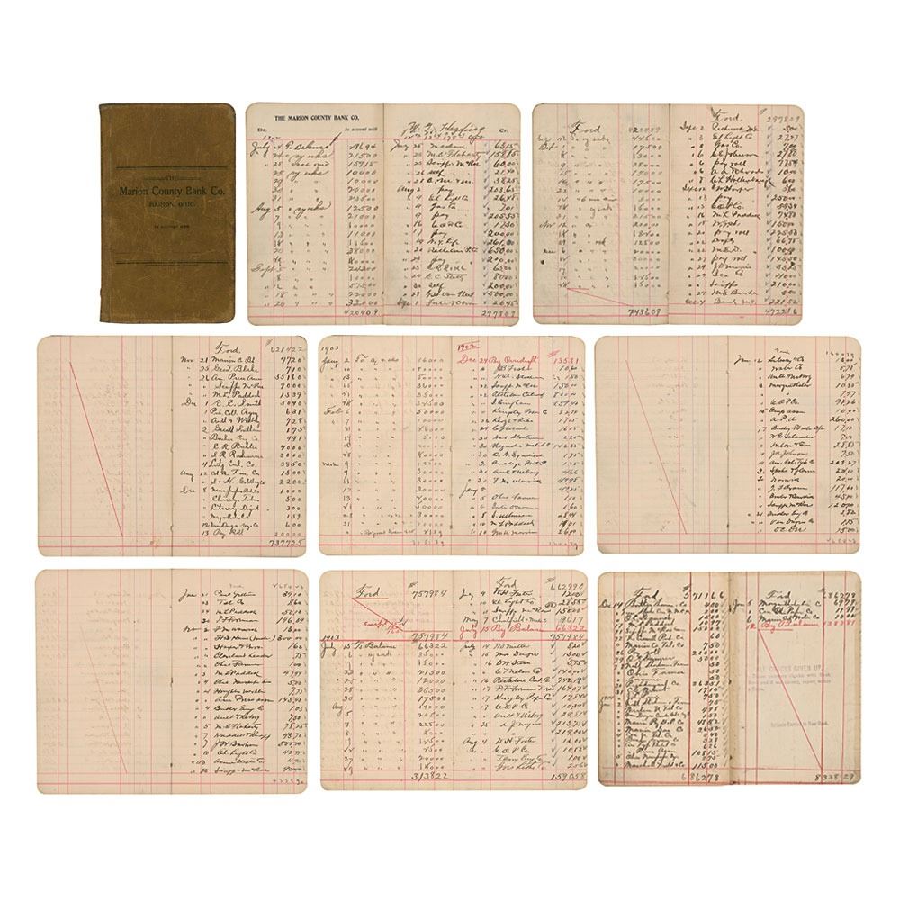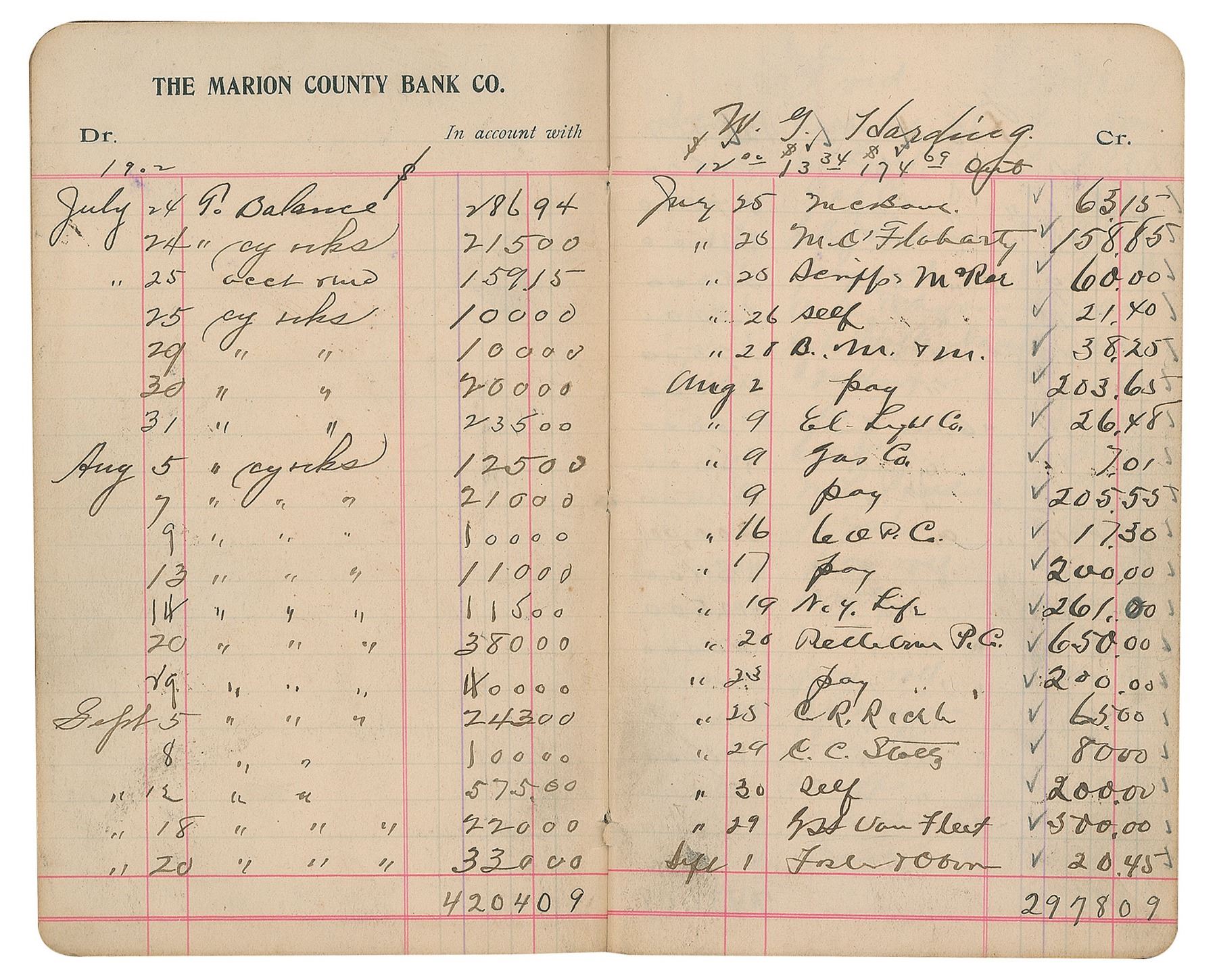 Warren G. Harding's leatherbound Marion County Bank book for 1902–1904, 48 pages, 4 x 6.5, featuring numerous entries in his own hand, as well as clerical entries. The book records the balance over time and logs checks drawn on the account, with recipients including "W.G.H.," "Scripps," "pay roll," "Newspaper Pub. Co.," "Chicago Tribune," "Literary Digest," "Water Co.," "Harper & Bros.," "Cleveland Leader," "Houghton-Mifflin," "Ohio Newspaper Syndicate," and the names of various individuals. In fine condition, with expected moderate handling wear. Harding's payments reveal his activity in the publishing industry as owner of the Marion Star newspaper, in addition to his attention to quotidian financial matters like paying utilities. A unique piece offering insight into Harding's life during this period of early 20th century.