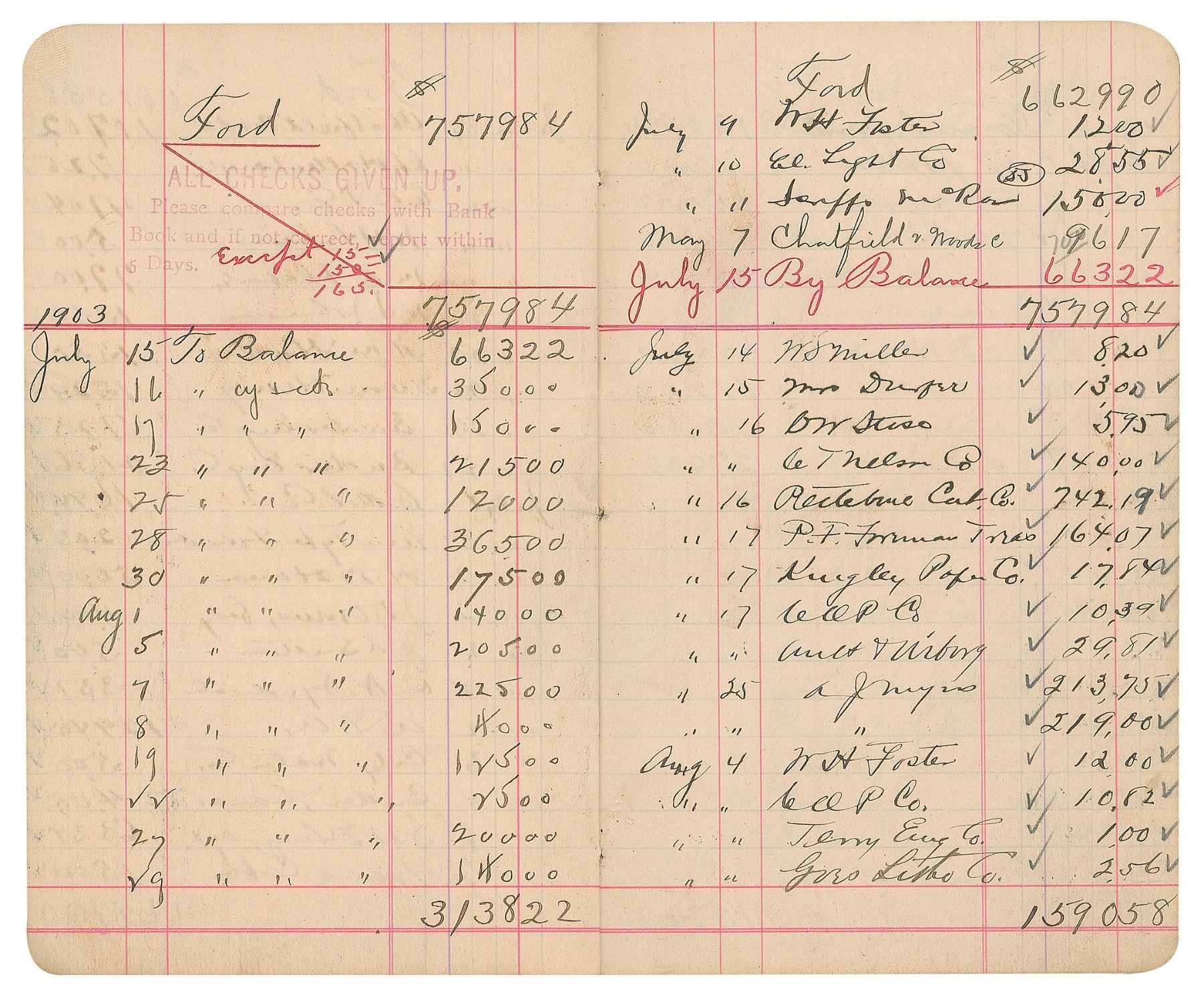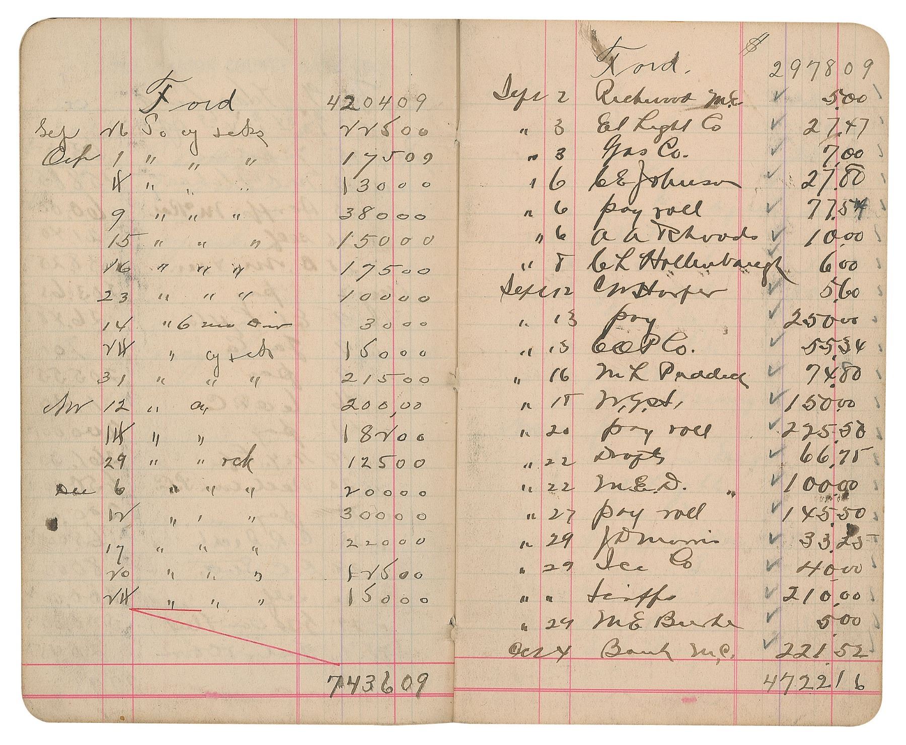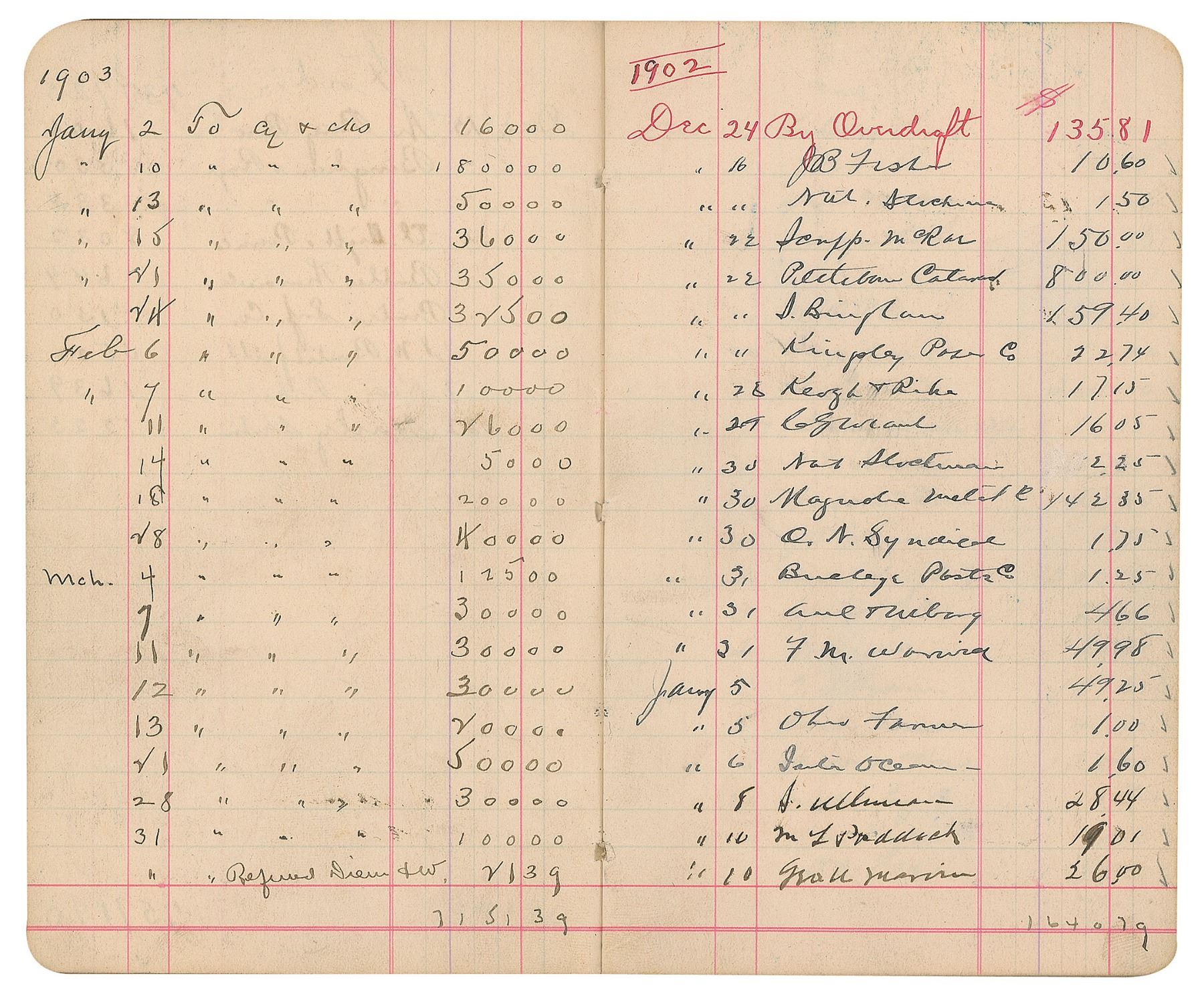 Warren G. Harding's leatherbound Marion County Bank book for 1902–1904, 48 pages, 4 x 6.5, featuring numerous entries in his own hand, as well as clerical entries. The book records the balance over time and logs checks drawn on the account, with recipients including "W.G.H.," "Scripps," "pay roll," "Newspaper Pub. Co.," "Chicago Tribune," "Literary Digest," "Water Co.," "Harper & Bros.," "Cleveland Leader," "Houghton-Mifflin," "Ohio Newspaper Syndicate," and the names of various individuals. In fine condition, with expected moderate handling wear. Harding's payments reveal his activity in the publishing industry as owner of the Marion Star newspaper, in addition to his attention to quotidian financial matters like paying utilities. A unique piece offering insight into Harding's life during this period of early 20th century.