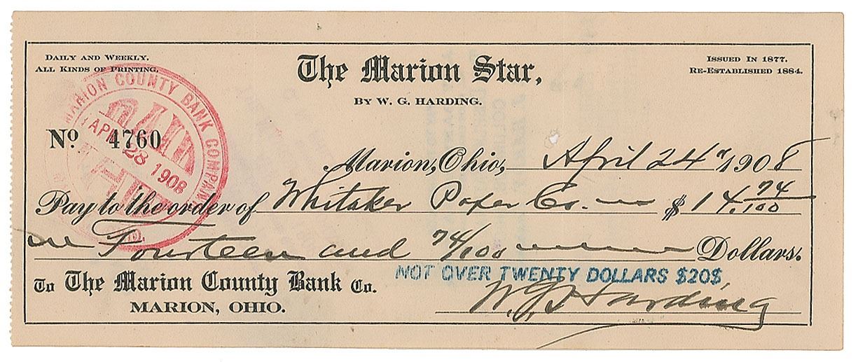 The Marion Star business check, 8 x 3.25, filled out and signed by Harding, "W. G. Harding," payable to Whitaker Paper Co. for $14.74, April 24, 1908. In fine condition. Harding bought the Ohio daily newspaper The Marion Daily Star in 1884, and held ownership of the paper until mid-1923. Although Harding's editorial department slanted toward the Republican platform, the daily paper remained somewhat neutral due to its position as the newspaper of record for Marion County, Ohio. However, the Star's weekly publication served as the partisan arm of Harding's newspaper empire.