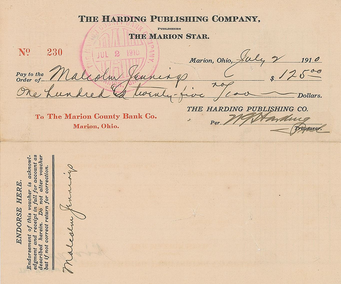 The Harding Publishing Company check, 8.25 x 3.5, filled out in another hand and signed by Harding, "W. G. Harding, Pres't," payable to Malcolm Jennings for $125, July 2, 1910. In fine condition, with a tear to center affecting nothing. Harding bought the Ohio daily newspaper The Marion Daily Star in 1884, and held ownership of the paper until mid-1923. Although Harding's editorial department slanted toward the Republican platform, the daily paper remained somewhat neutral due to its position as the newspaper of record for Marion County, Ohio. However, the Star's weekly publication served as the partisan arm of Harding's newspaper empire.