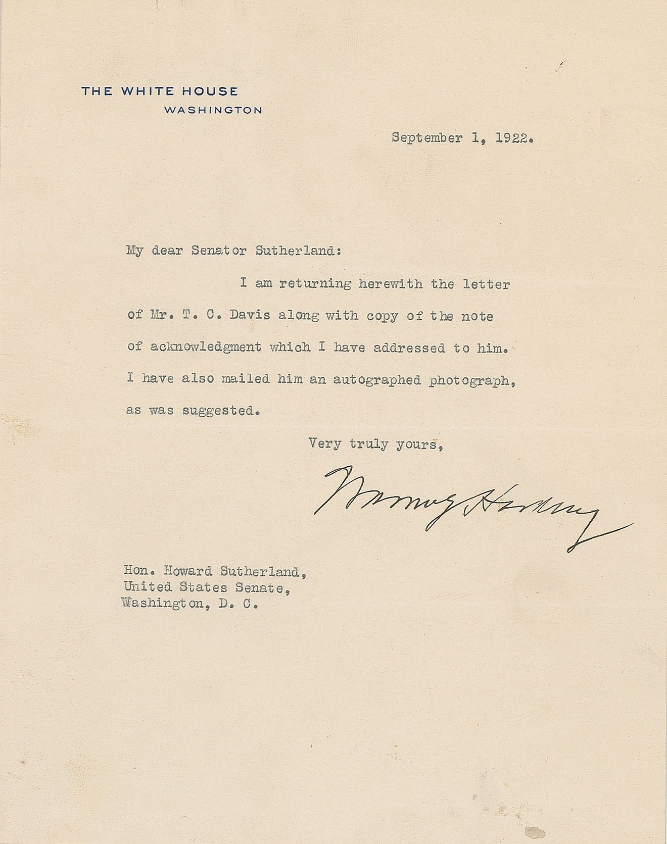 TLS as president, one page, 7 x 8.75, White House letterhead, September 1, 1922. Letter to West Virginia Senator Howard Sutherland, in full: "I am returning herewith the letter of Mr. T. C. Davis along with copy of the note of acknowledgment which I have addressed to him. I have also mailed him an autographed photograph, as was suggested." In very good to fine condition, with light creasing, small stains at the bottom, and two extra horizontal folds.