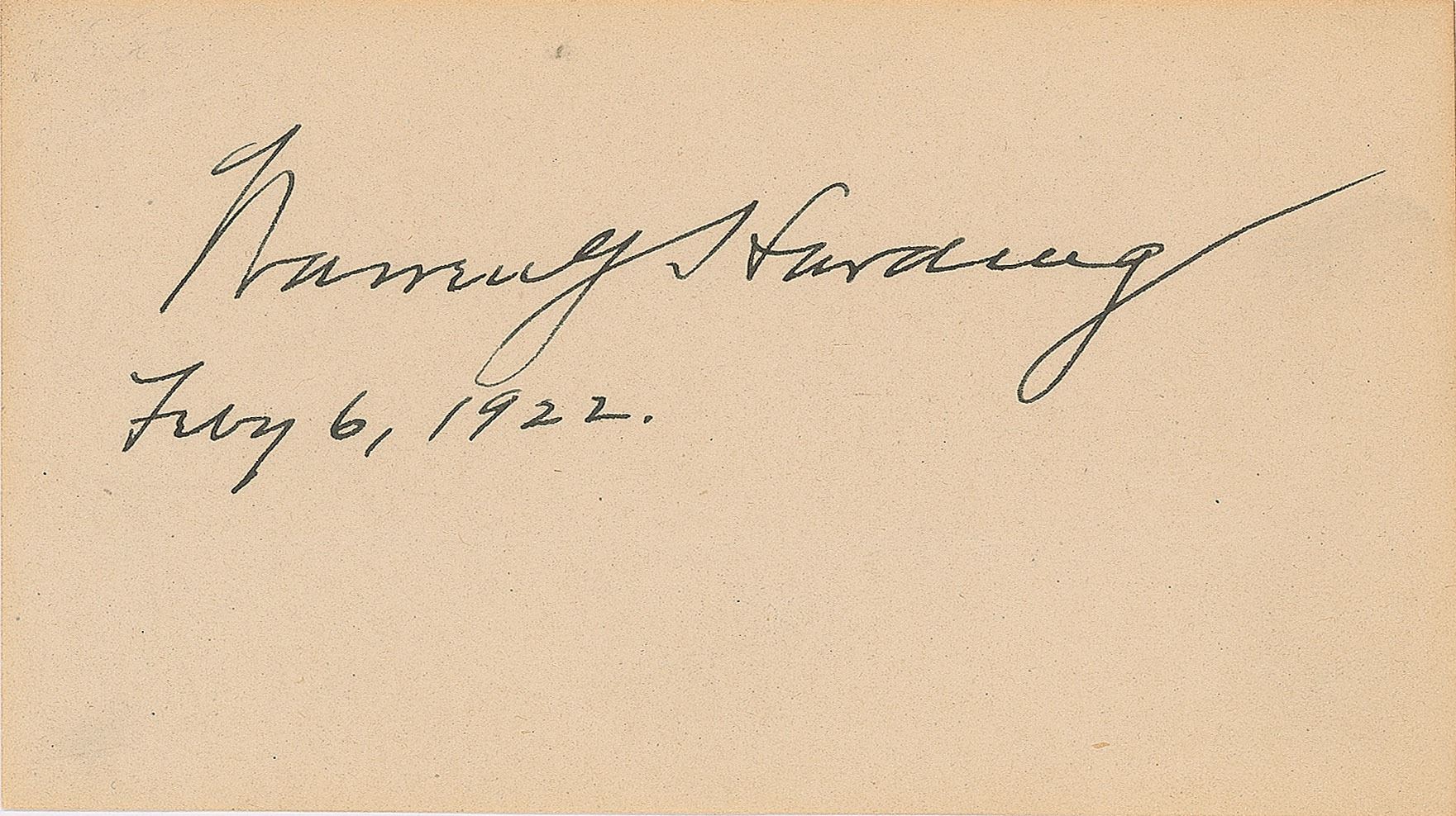 Bold and crisp ink signature as president, "Warren G. Harding, Feb'y 6, 1922,” on an off-white 5 x 2.75 slip. In fine condition, with a light horizontal fold to the lower blank area.