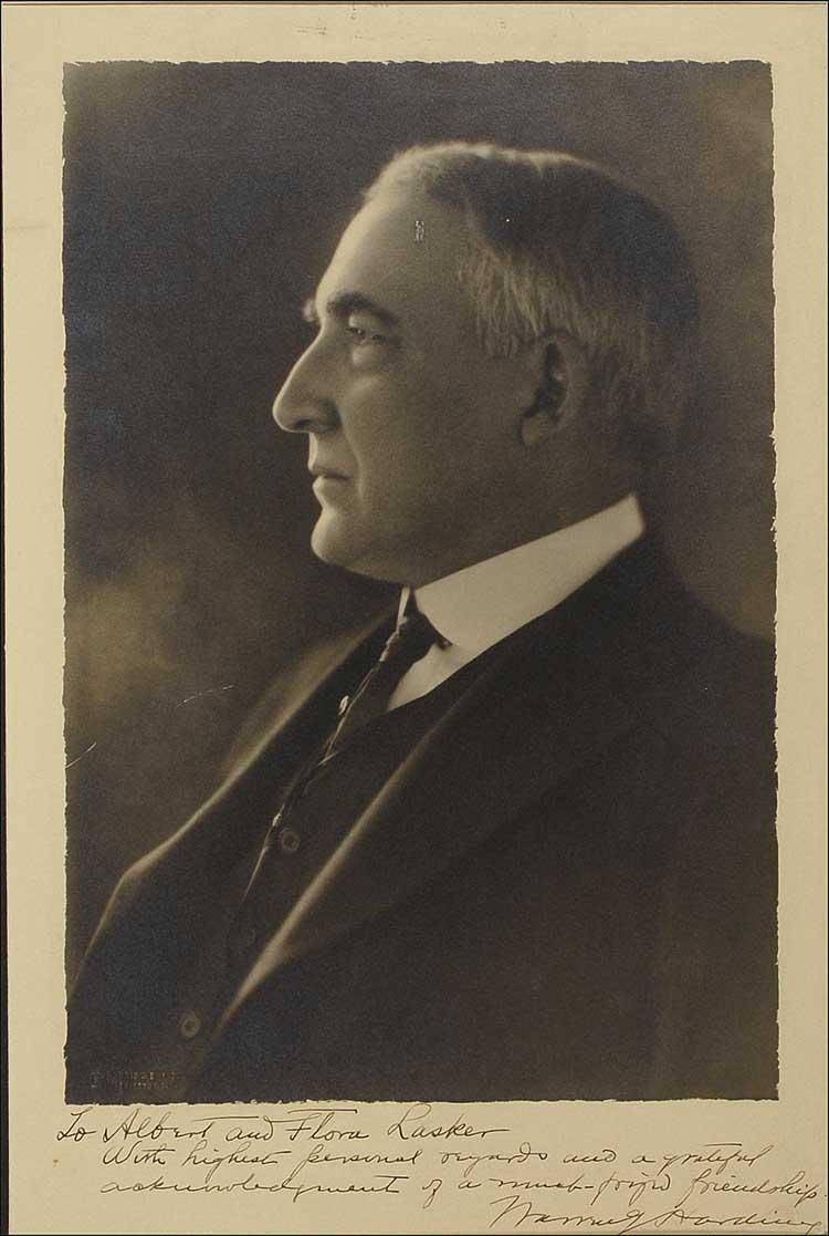 Vintage matte-finish 10.5 x 15.75 Harris and Ewing profile portrait, signed and inscribed in fountain pen “To Albert and Flora Lasker, With highest personal regards and a grateful acknowledgement of a much-prized friendship. Warren G. Harding.” Double matted to an overall size of 15 x 20.25. Surface ding to forehead, some scattered light silvering to darker areas, a bit of light foxing to top border, and a few scattered surface marks, otherwise fine condition. Albert Lasker (1880-1952) was a prominent advertising executive during the first half of the 20th century. During his 40-year tenure with the Chicago-based Lord and Thomas, Lasker built the company into the largest advertising agency in the United States. Through his innovation and leadership, he helped to usher in the new age of modern advertising. Pre-certified John Reznikoff/PSA/DNA and RRAuction COA.