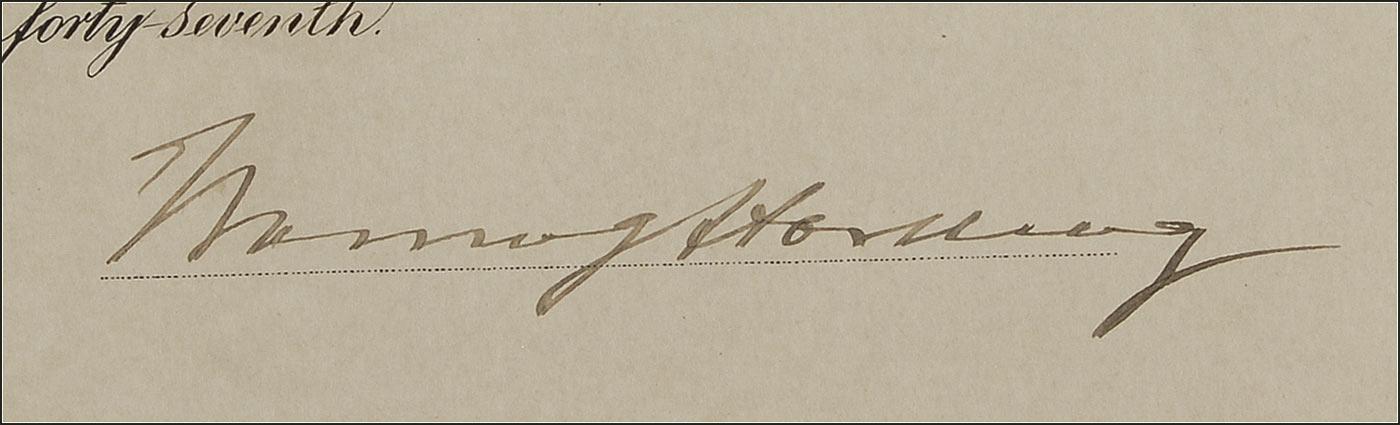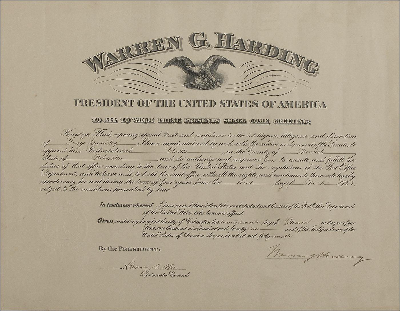 Partly-printed DS as president, one page, 18 x 14, March 27, 1923. President Harding appoints George Beardsley a Postmaster of Clarks, Nebraska. Nicely signed at the conclusion by Harding, and countersigned by Postmaster General Harry S. New. A uniform shade of toning, a bit of light soiling and a couple trivial edge tears, otherwise fine condition. Pre-certified John Reznikoff/PSA/DNA and RRAuction COA.