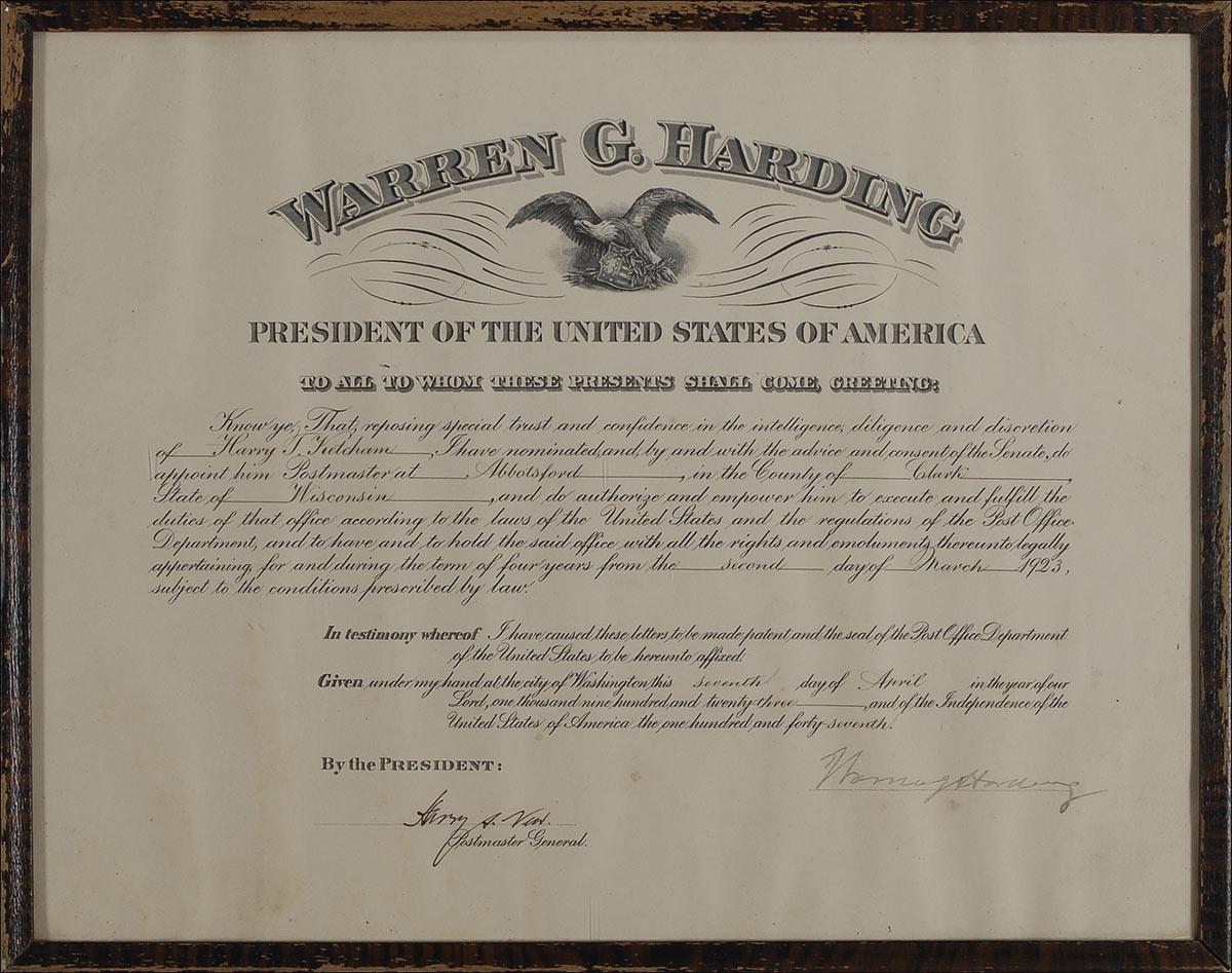 Bank check, 6 x 2.5, filled out by Harding and signed “W.G. Harding,” payable to Thalman and Levi for $1720.11, November 13, 1916. Light creasing, a vertical fold, a small tear, and a tiny hole near the top edge, otherwise fine condition. Pre-certified John Reznikoff/PSA/DNA and RRAuction COA.