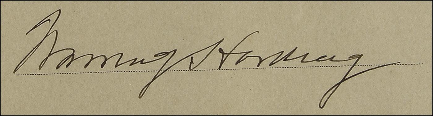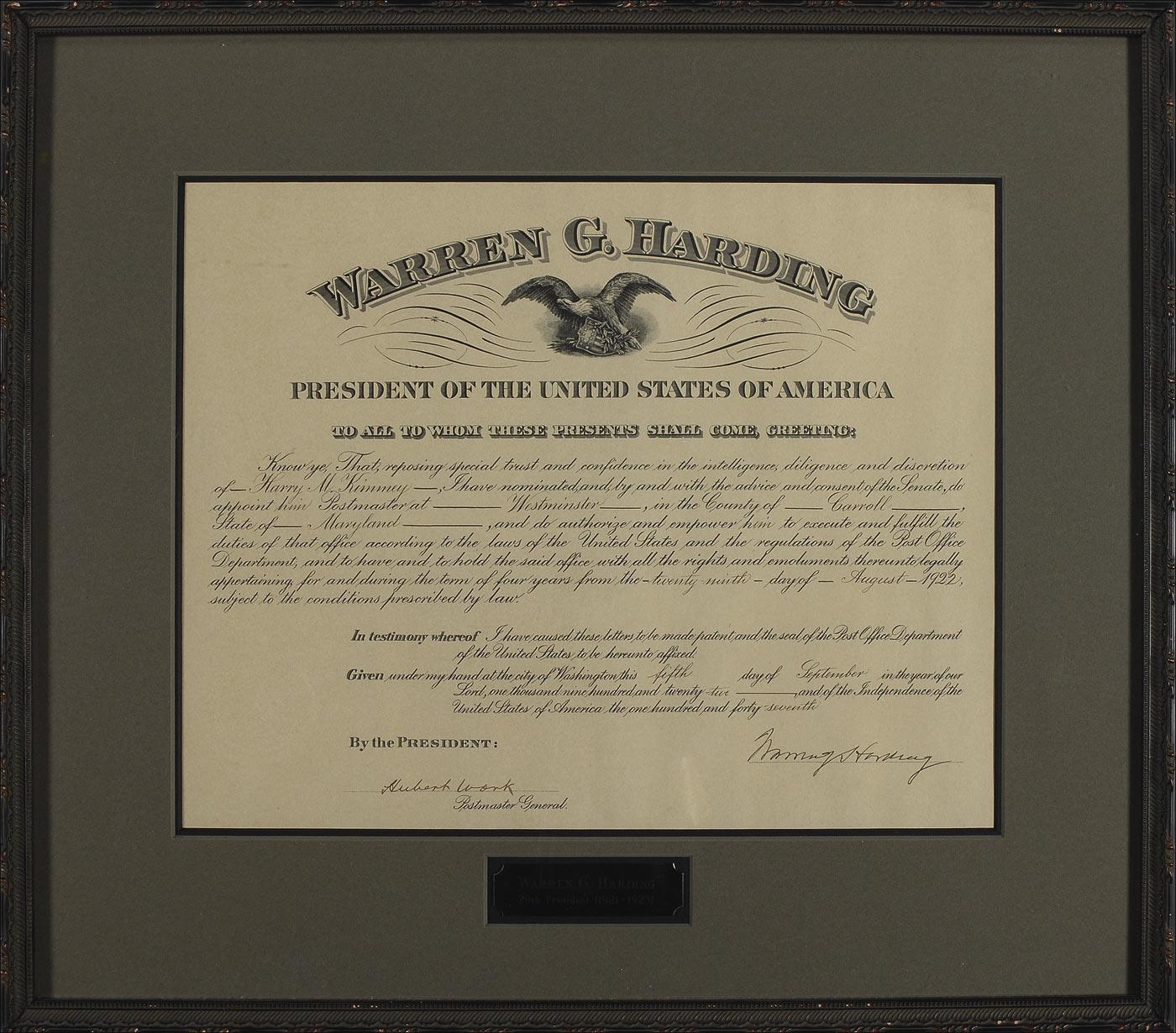 Partly-printed DS as president, one page, 15.25 x 12.25, September 5, 1922. President Harding appoints Harry M. Kinney to the position of Postmaster of Westminster, Maryland. Signed at the bottom by Harding, and countersigned by Postmaster General Hubert Work. Double matted and framed with a small plaque, to an overall size of 21.75 x 19. In fine condition, with a mild overall shade of toning. Pre-certified John Reznikoff/PSA/DNA and RRAuction COA.