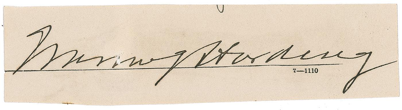 Ink signature, “Warren G. Harding,” on an off-white 4.25 x 1 slip clipped from a larger document. Paper loss affecting one letter of signature, and uniform light toning from adhesive on reverse, otherwise fine condition. Pre-certified John Reznikoff/PSA/DNA and RRAuction COA.