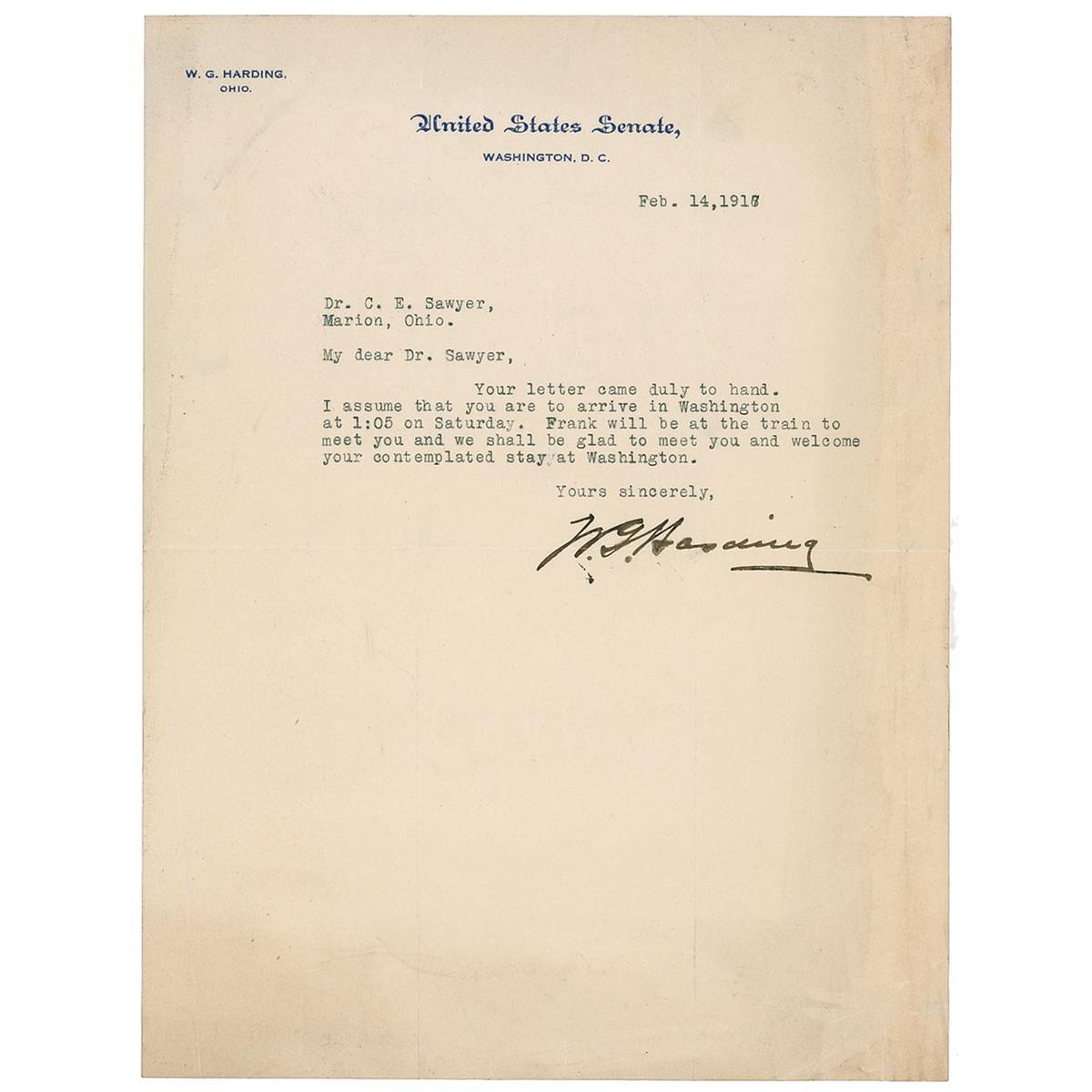 TLS signed “W. G. Harding,” one page, 8 x 10.5, United States Senate letterhead, February 14, 1917. Letter to an arriving doctor from Ohio. In part: “I assume that you are to arrive in Washington at 1:05 on Saturday. Frank will be at the train to meet you and we shall be glad to meet you and welcome your contemplated stay at Washington.” In very good condition, with intersecting folds, two affecting signature, scattered edge creasing and wrinkling, and some mild toning.