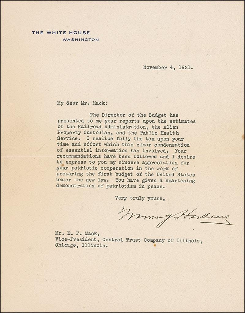 TLS as president, one page, 7 x 9, White House letterhead, November 4, 1921. A letter to Mr. Mack of the Central Trust Company of Illinois. In part: “The Director of the Budget has presented to me your reports upon the estimates of the Railroad Administration, the Alien Property Custodian and the Public Health service. I realize fully the tax upon your time and effort which this clear condensation of essential information has involved. Your recommendations have been followed and I desire to express to you my sincere appreciation for your patriotic cooperation in the work of preparing the first budget of the United States under the new law. You have given a heartening demonstration of patriotism in peace.”