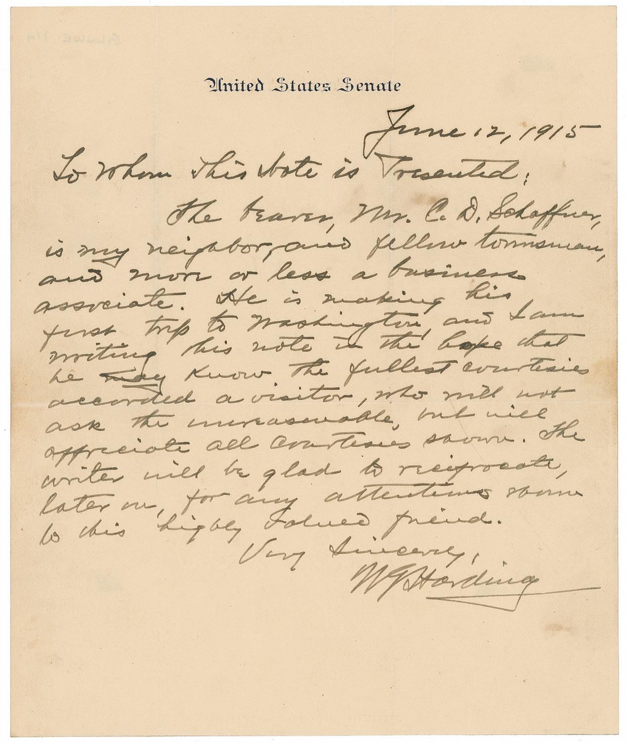 Rare ALS signed “W. G. Harding,” one page, 8 x 9.75, United States Senate letterhead, June 12, 1915. A letter of introduction for C. D. Schaffer. In part: “The bearer…is my neighbor…and more or less a business associate. He is making his first trip to Washington, and I am writing this note in the hope that he may know the fullest courtesies accorded a visitor, who will not ask the unreasonable, but will appreciate all courtesies shown. The writer will be glad to reciprocate, later on, for any attentions shown to this highly valued friend.” In fine condition, with intersecting folds, one through a single letter of signature, and some scattered light toning and spotting. Handwritten letters from any part of Harding’s political career are scarce and highly desirable.