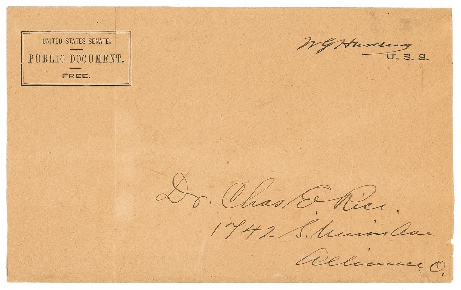 Free franked United States Senate envelope, 10.5 x 6.5, addressed in another hand to “Dr. Chas. E. Rice,” in Alliance, Ohio, and franked in the upper right, “W. G. Harding.” In fine condition, with two vertical folds, scattered light toning and soiling, and a couple small edge tears. One of only a handful of Harding free franks known.