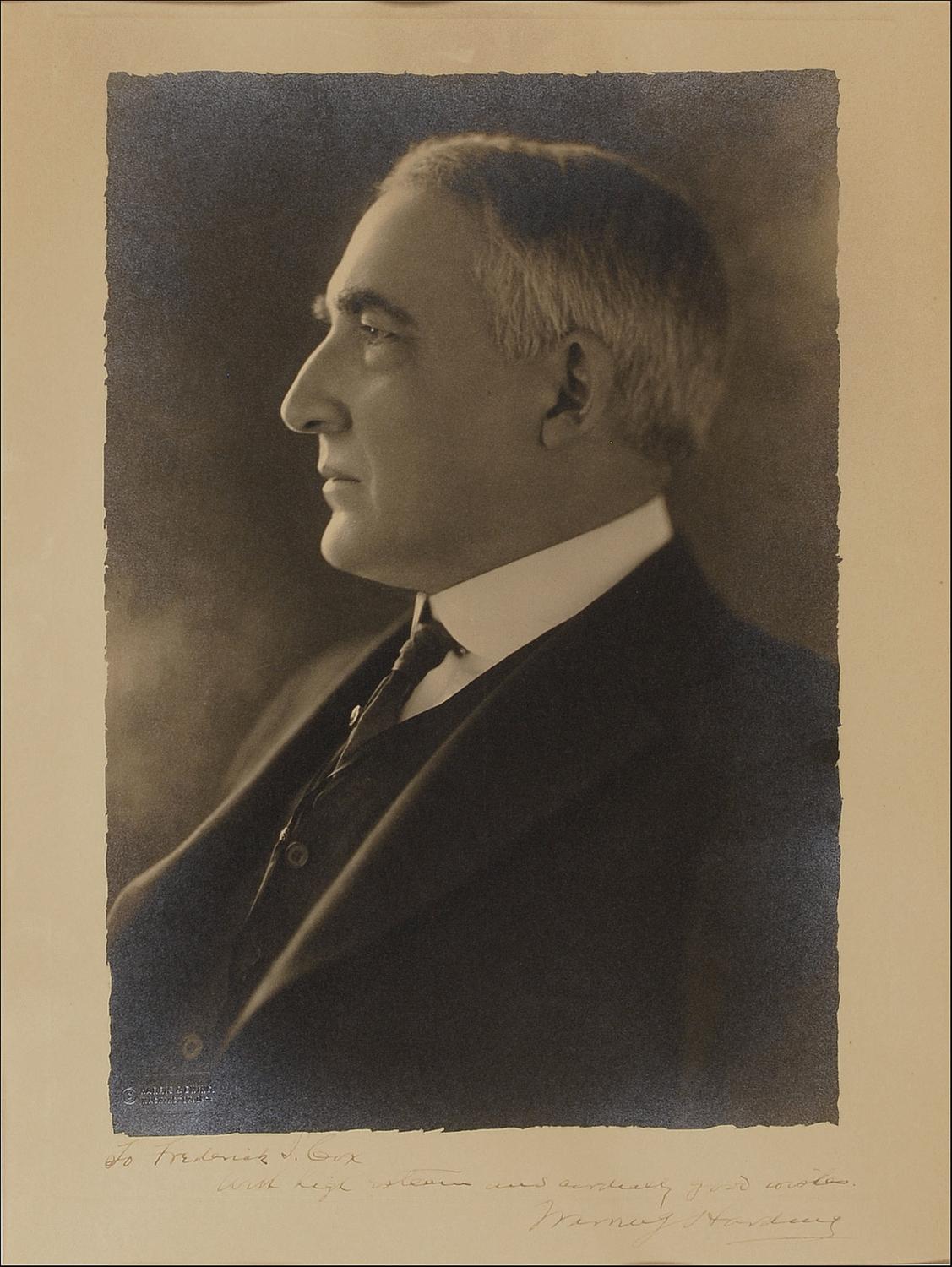 Vintage matte-finish 12 x 16 Harris and Ewing profile portrait, signed and inscribed in the lower border in fountain pen “To Frederick Cox, with high esteem and cordially good wishes, Warren G. Harding.” In very good to fine condition, with silvering to edges of image, uniform toning to borders, as well as a few light spots, and a few subtle ripples. A visually striking piece given that most presidential portraits found are 8 x 10 or smaller.